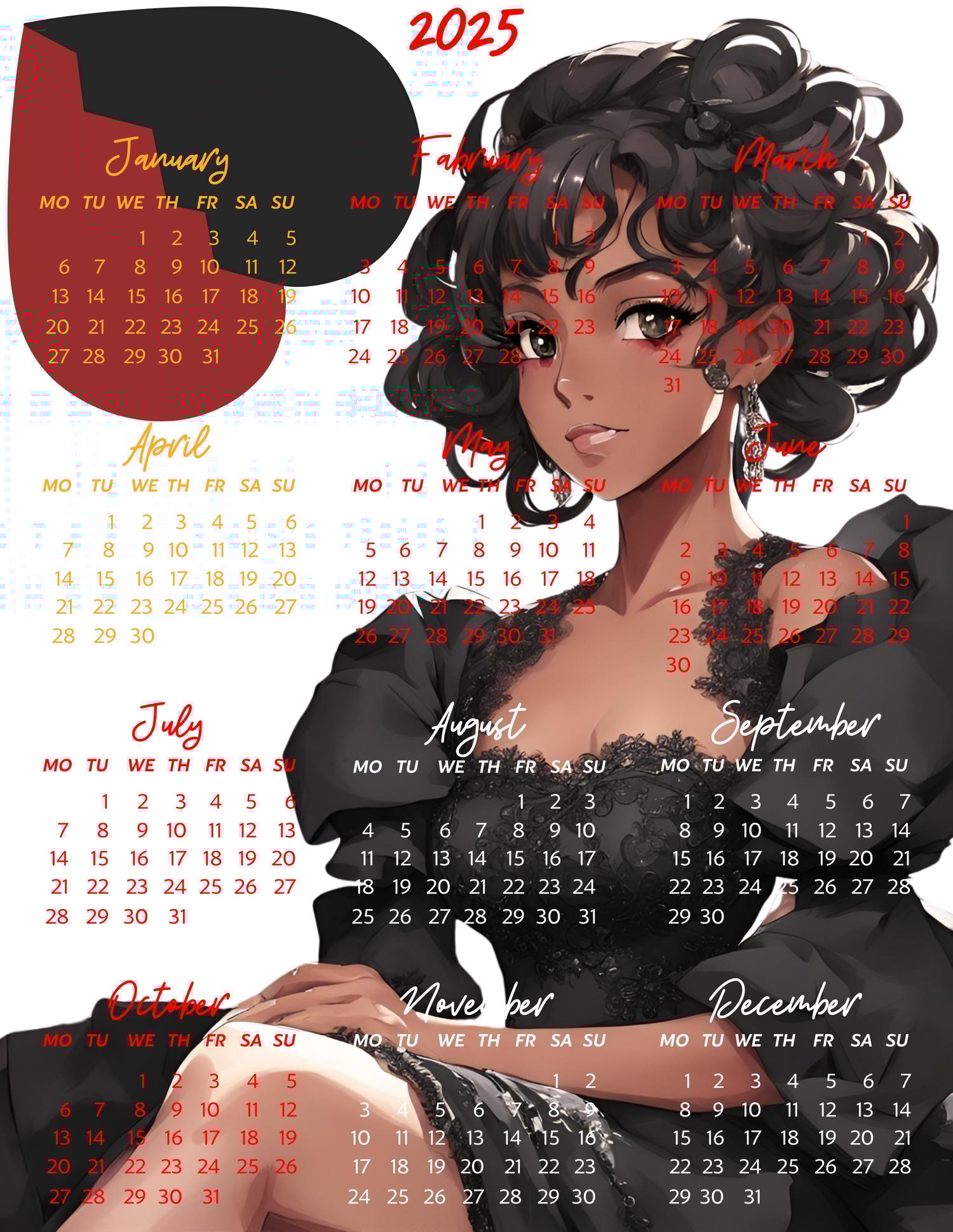 SEXY BLACK ANIME 12 MONTH 2025 CALENDAR PAGE