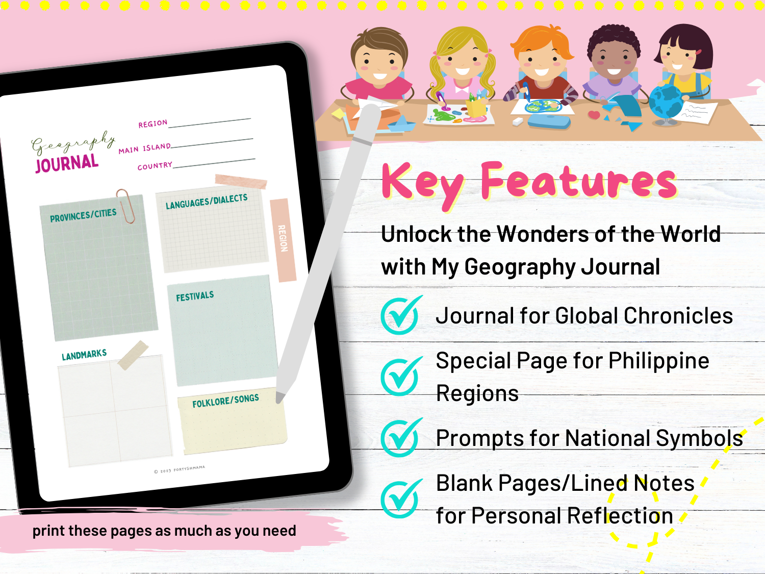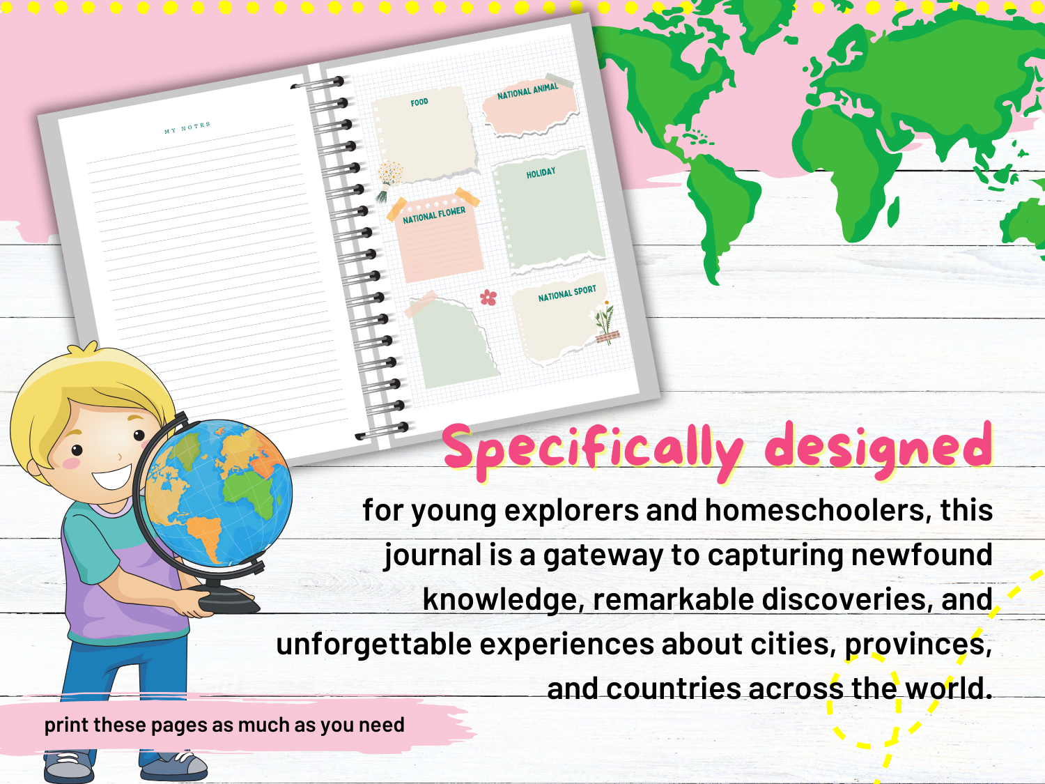 Specifically designed for young explorers and homeschoolers, this journal is a gateway to capturing newfound knowledge, remarkable discoveries, and unforgettable experiences about cities, provinces, and countries across the world. And guess what? We've also included a special journal page dedicated to exploring the captivating regions of the Philippines!
