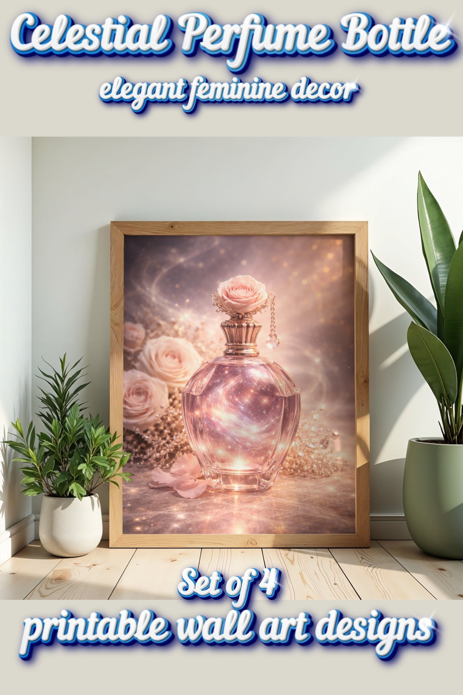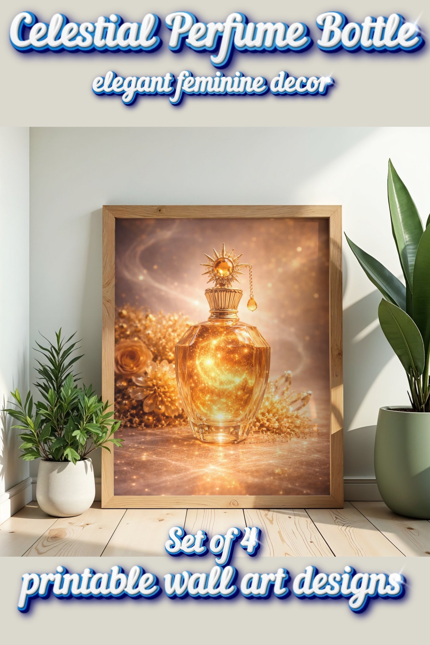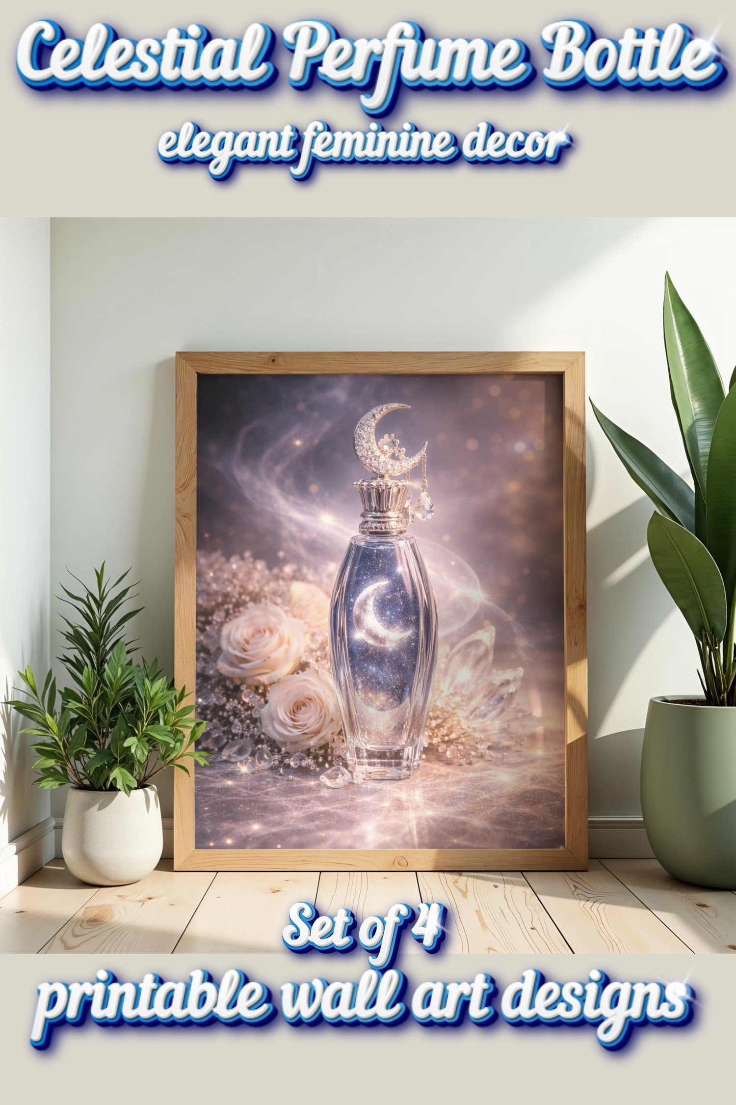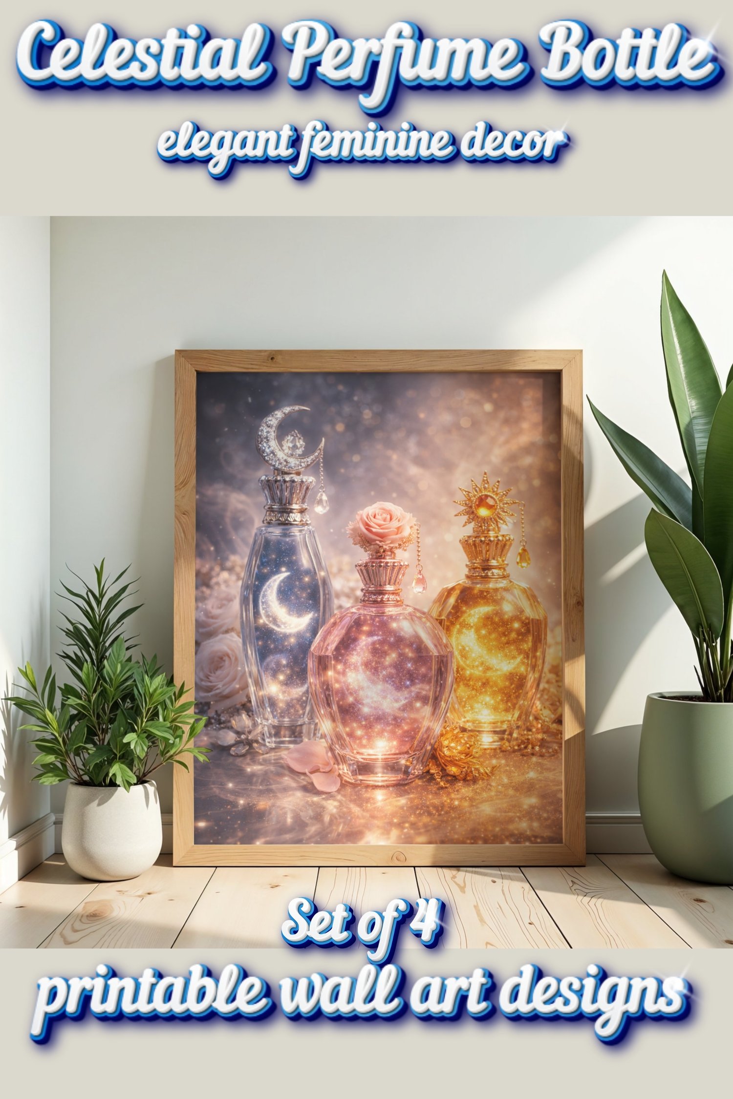 This collection features elegant perfume bottle artwork inspired by the moon, sun, roses, starlight, and dreamy cosmic details. The soft luminous tones and feminine fantasy style make this set perfect for bedrooms, beauty rooms, vanity spaces, dressing areas, and romantic gallery walls.