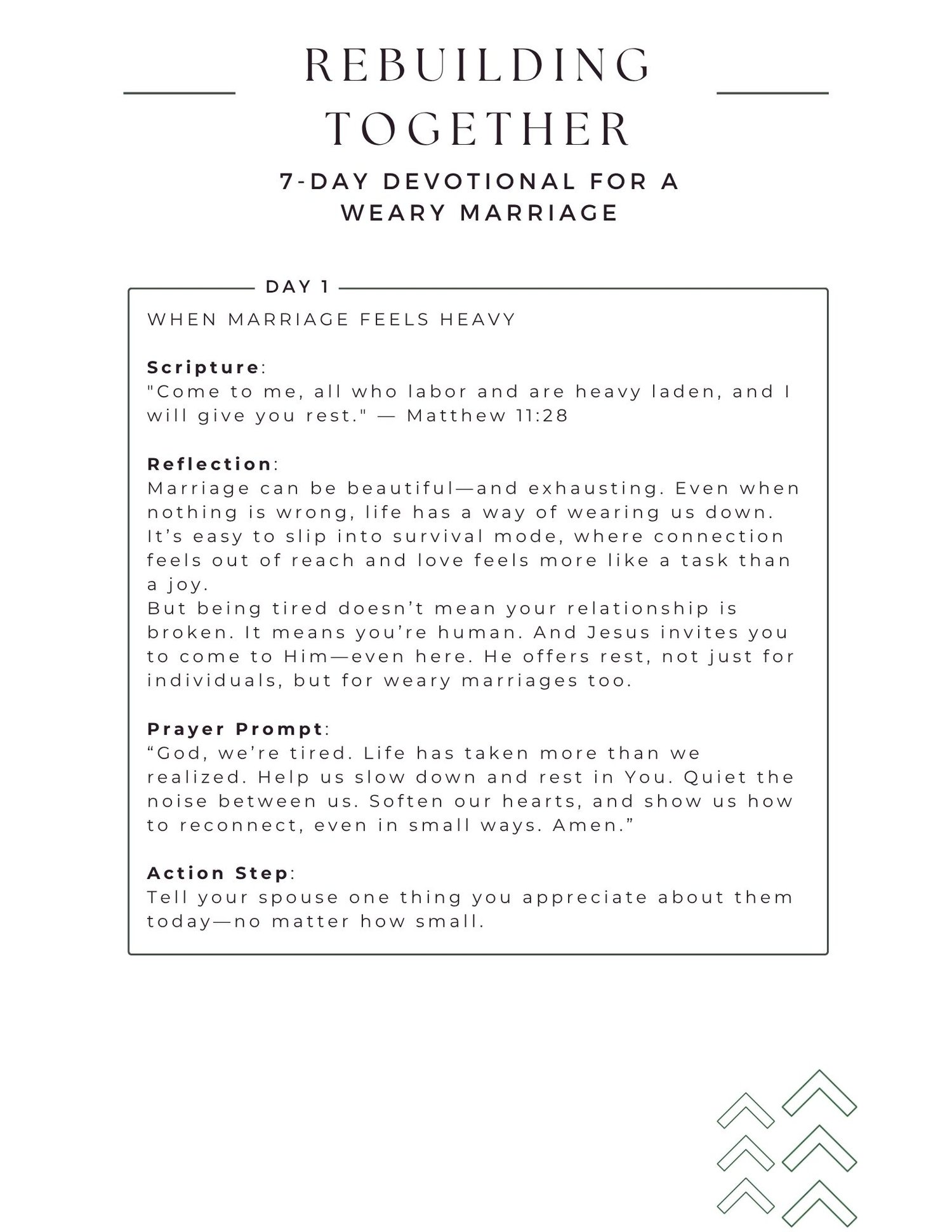 Over the course of 7 days, you’ll walk through short, heartfelt devotionals rooted in Scripture, each focused on a different aspect of relational healing—emotional safety, joy, unity, hope, and more. With simple prayer prompts and meaningful (but low-pressure) action steps, this guide helps you reconnect with God and each other one honest moment at a time.