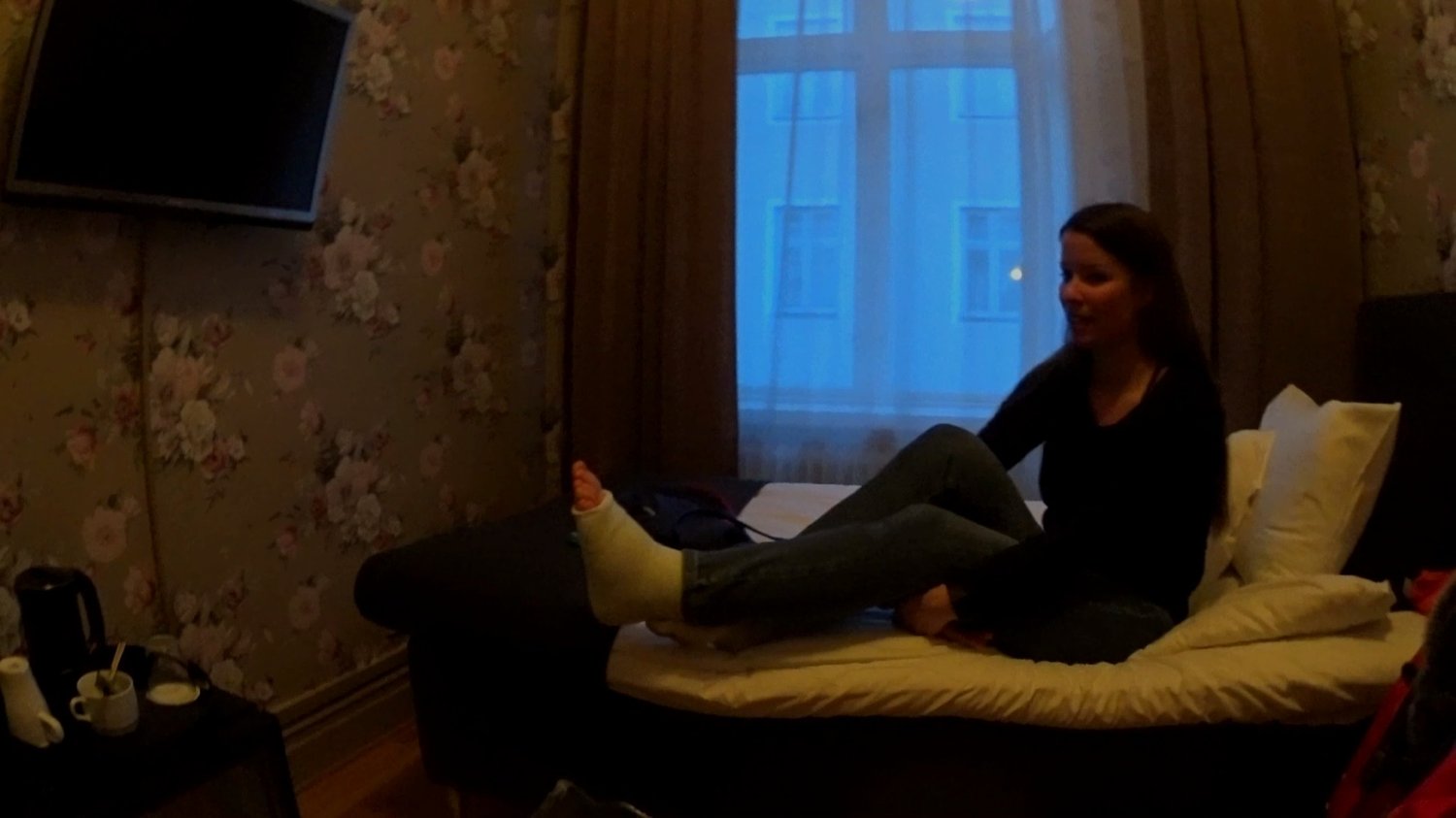 Lucy has been crutching all day long in the city with her broken left foot today, she’s had some beer and drinks with her friends and is quite tipsy and drunk right now. It has already started to get dark outside as well, it’s time to get Lucy back to the hotel safe. Nice and hot closeups were filmed in the elevator and even more were made at the hotel room before we leave to let Lucy get her beauty sleep.