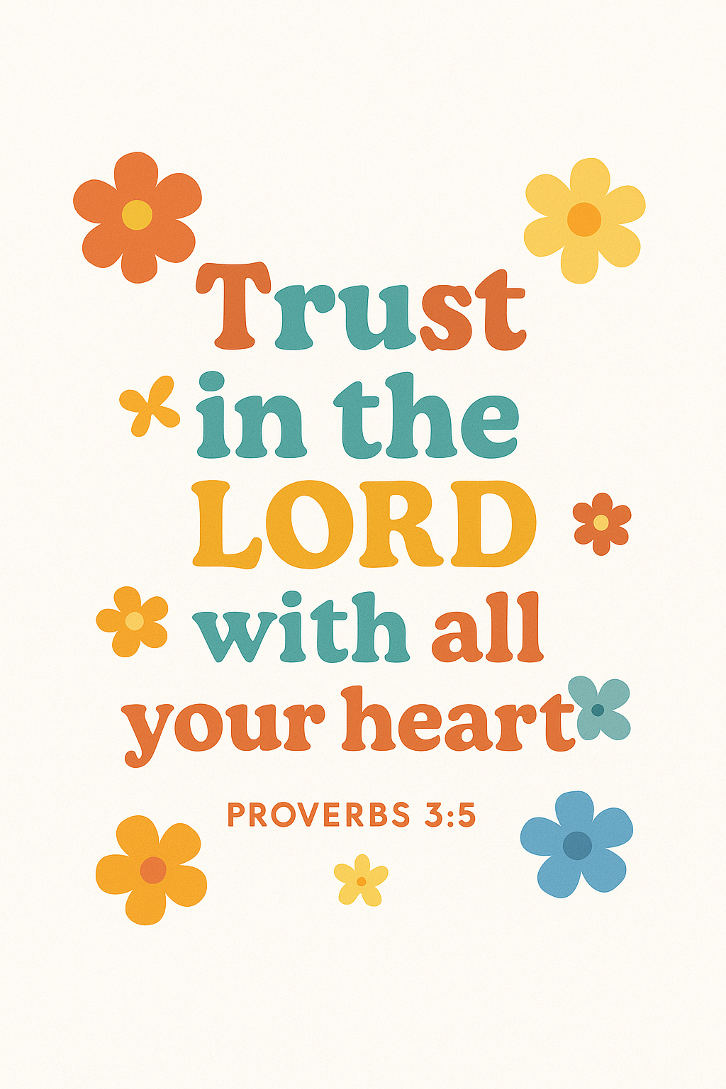 Cheerful, colorful, and faith-filled — this printable wall art brings Proverbs 3:5 to life in a way that’s engaging for kids and uplifting for all ages! With retro-inspired lettering and happy floral details, it's perfect for bedrooms, nurseries, playrooms, Sunday schools, and Christian homeschooling environments.