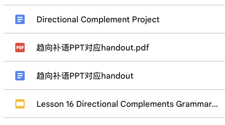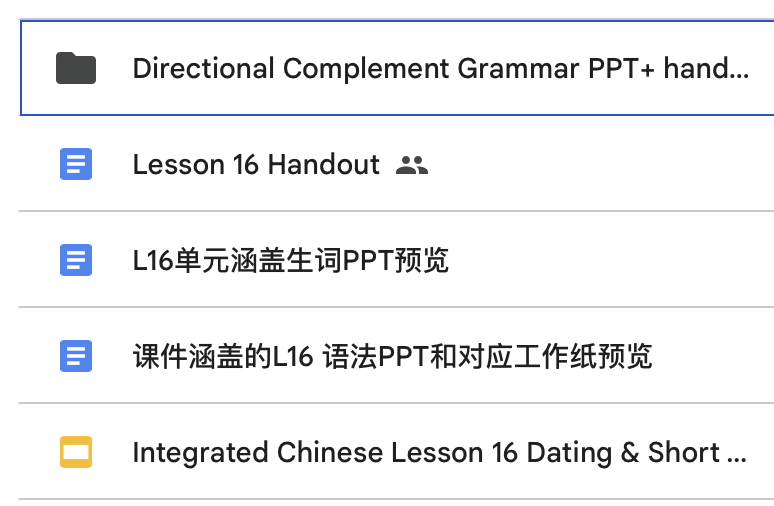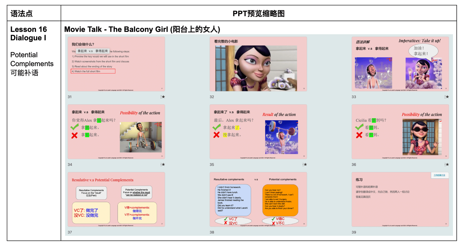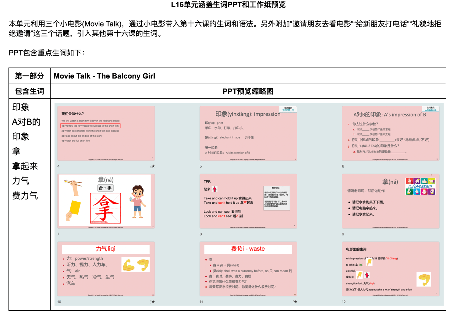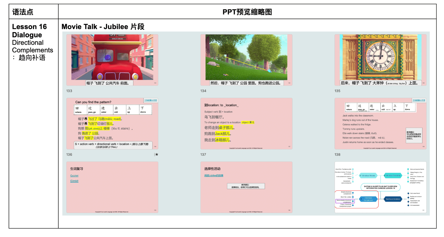 这个单元的特色是通过三个小电影(Movie Talk)引入第十六课的生词和语法,让学生在故事的语境中轻松掌握。同时,我们还设计了directional complement project,让学生拍摄自己在生活中使用趋向补语的例子,在用中学,充分展示自己的单元学习成果。