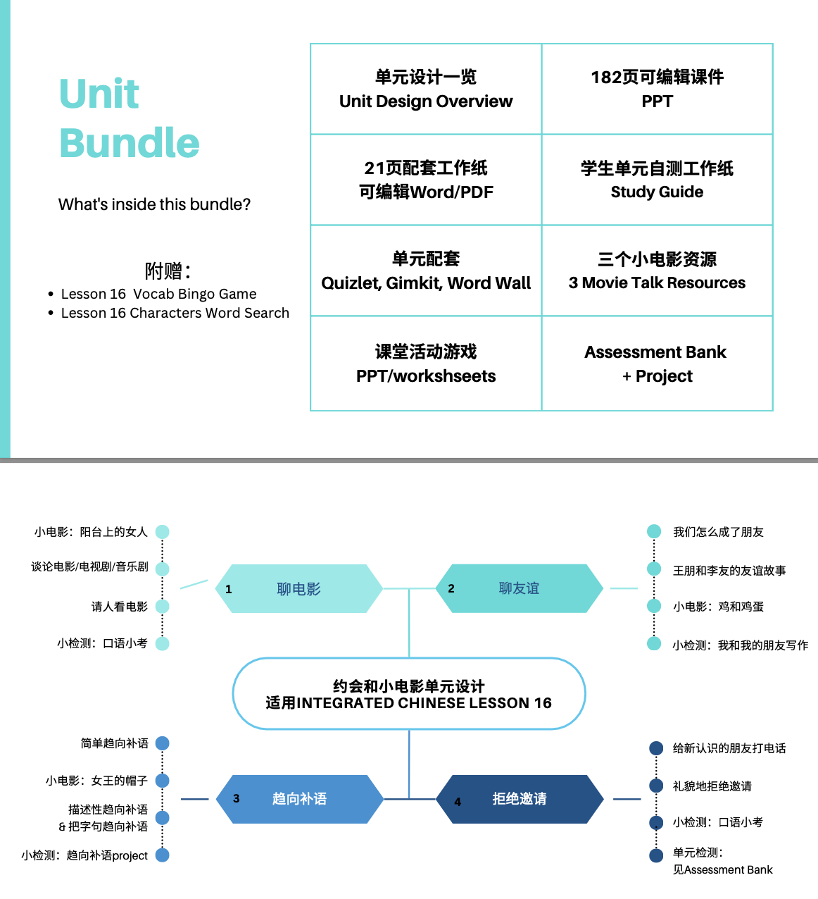 这套“约会”单元,采用反向设计(backward design)原理精心打造,旨在帮助学生在真实的语境中熟练掌握《中文听说读写》(Integrated Chinese) 课本第十六课《约会》的核心词汇和语法点。