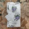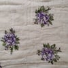 An airy gauze fabric with purple roses with green leaves.