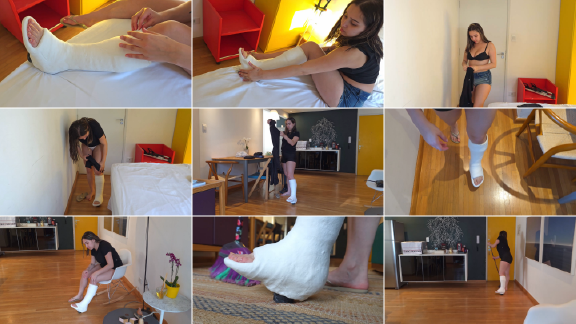 Bianca shows her cast in detail, puts away her crutches, and changes clothes. Thanks to the cast heel, she is able to carry out various household tasks, such as folding and putting away clothes, tidying up the house, and sweeping the floor.