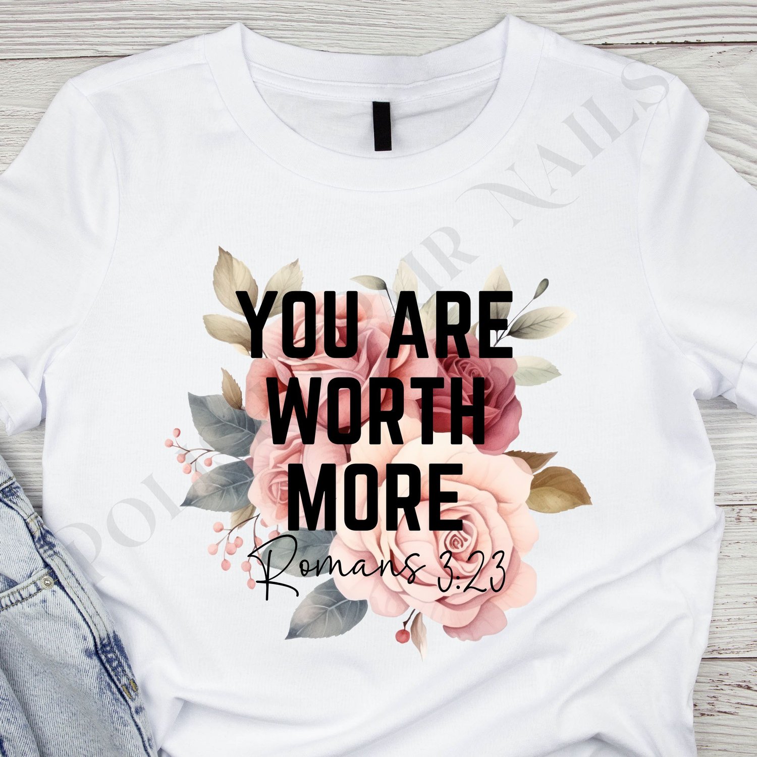 Embrace a message of self-worth and grace with this inspiring 'You Are Worth More Than Your Failures' t-shirt. The design features a beautiful watercolor floral bouquet in soft pinks and greens, providing a gentle backdrop to the powerful words: 'YOU ARE WORTH MORE THAN YOUR FAILURES.' Below, the scripture reference 'Romans 3:23' is subtly included, reminding us of the verse: 'for all have sinned and fall short of the glory of God.' This verse, in context, speaks to God's redemptive love despite human imperfection.