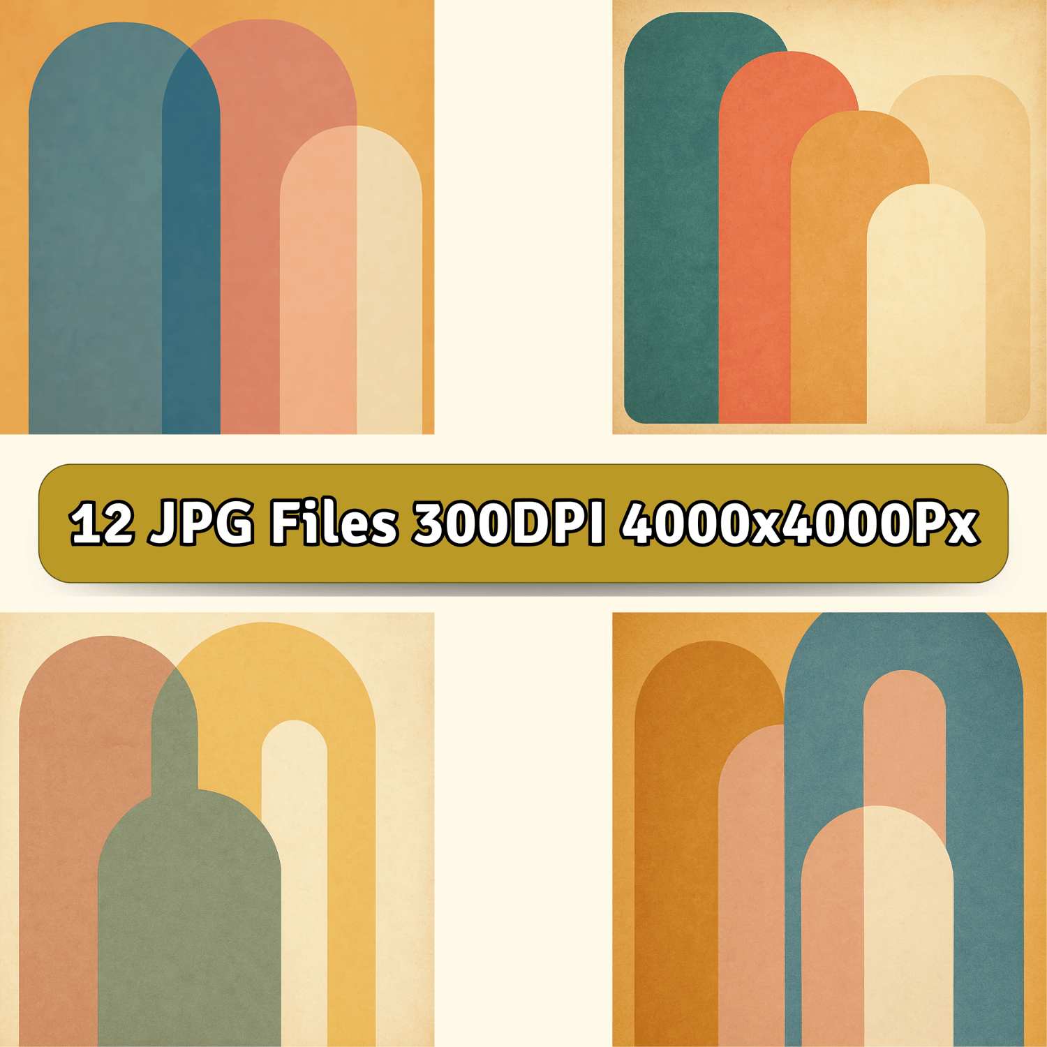 Elevate your creative projects with this stylish pack of retro abstract background designs. Inspired by mid-century modern aesthetics, this collection features bold arch shapes, vintage color palettes, and warm textured finishes. These high-resolution JPG files are ideal for creators looking to add a trendy retro vibe to their visual content.