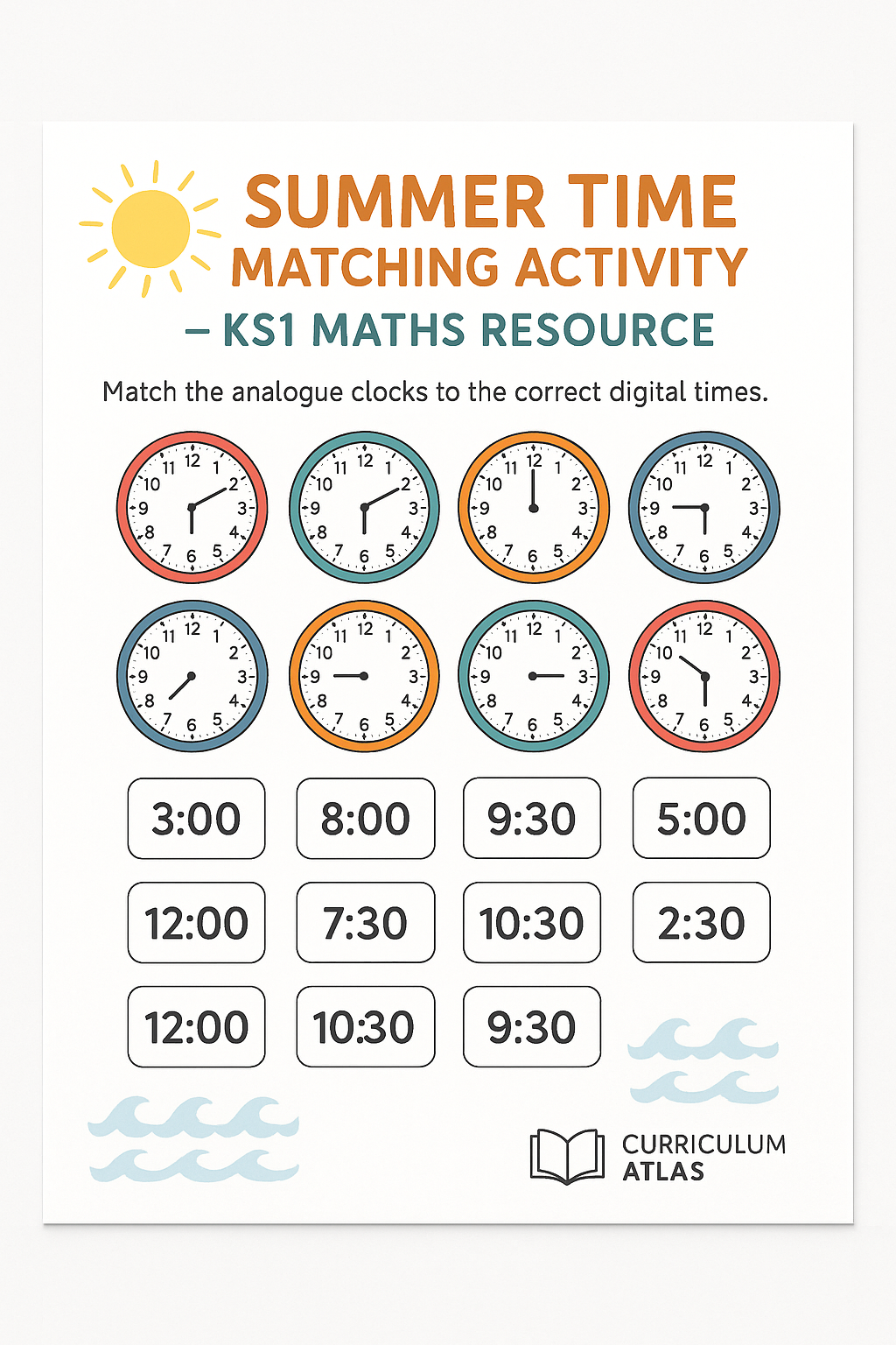 Help your learners develop time-telling skills with this fun and engaging Summer Time Matching Activity Pack. Designed for EYFS and KS1 learners, these worksheets combine visual clocks with matching analogue and digital times. Perfect for summer-themed maths lessons, early finishers, or home learning tasks.