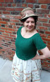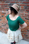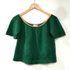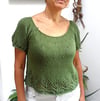This is a pattern for a crop top with short sleeves and a scoop neckline. It is worked from the top down and in the round with a circular yoke. There is a simple Bobble detail over the body created by increases and decreases and lace border on both body and sleeves. The sleeve and bottom edges will open up with a bit of a flare, when blocked, due to the lacework. You may, also, work the simple crochet edge around the neckline, for a bit of added colour.