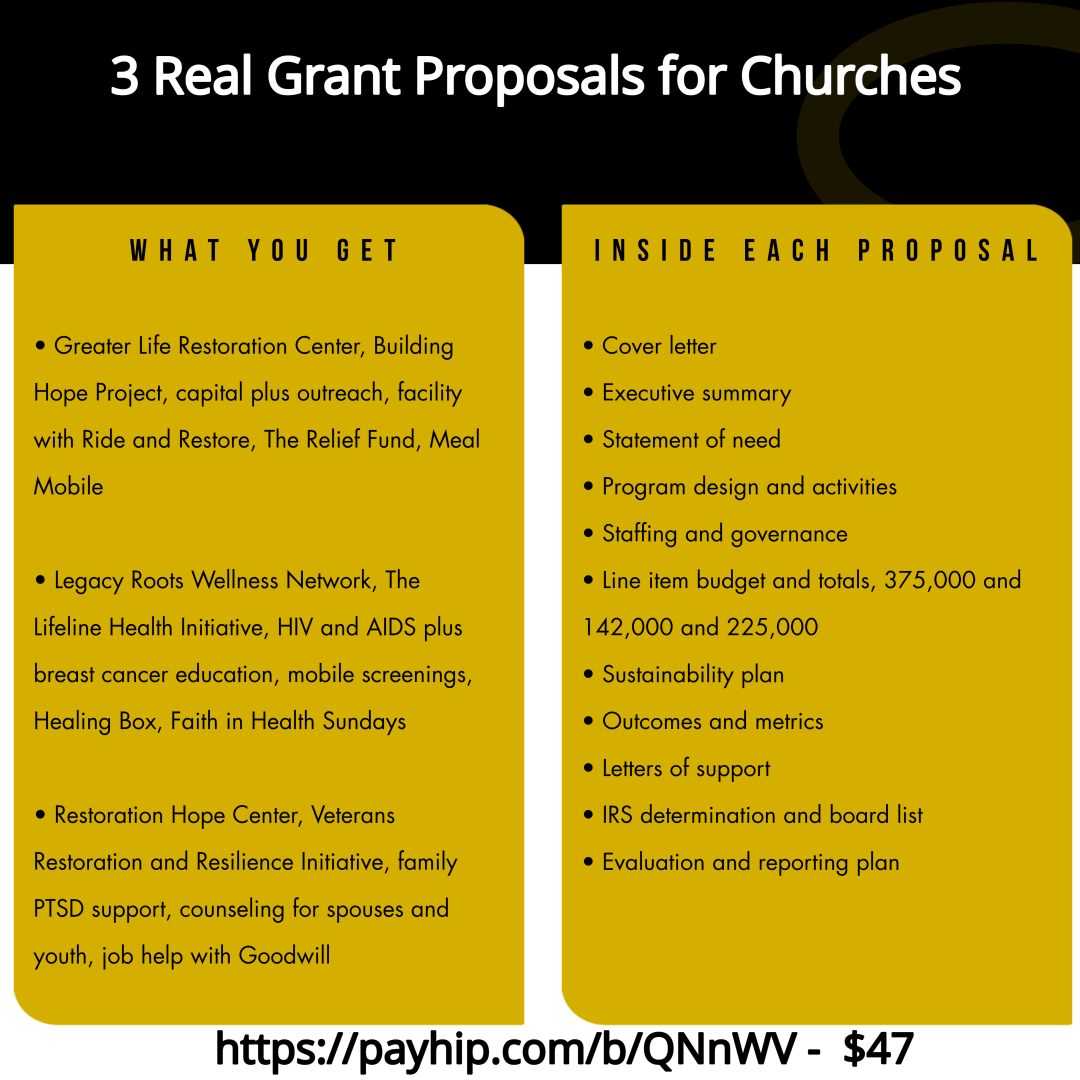 Stop guessing what funders want to see. This pack includes three full grant proposals written for churches and faith-based nonprofits, covering capital projects, health outreach, and trauma-informed programs.