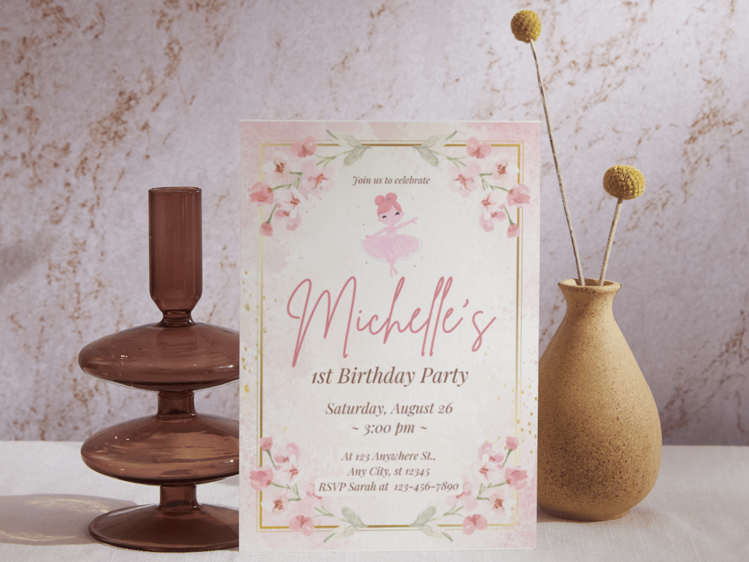 Pirouette your way into an amazing 1st birthday for your little ones with this Ballerina birthday invitation!