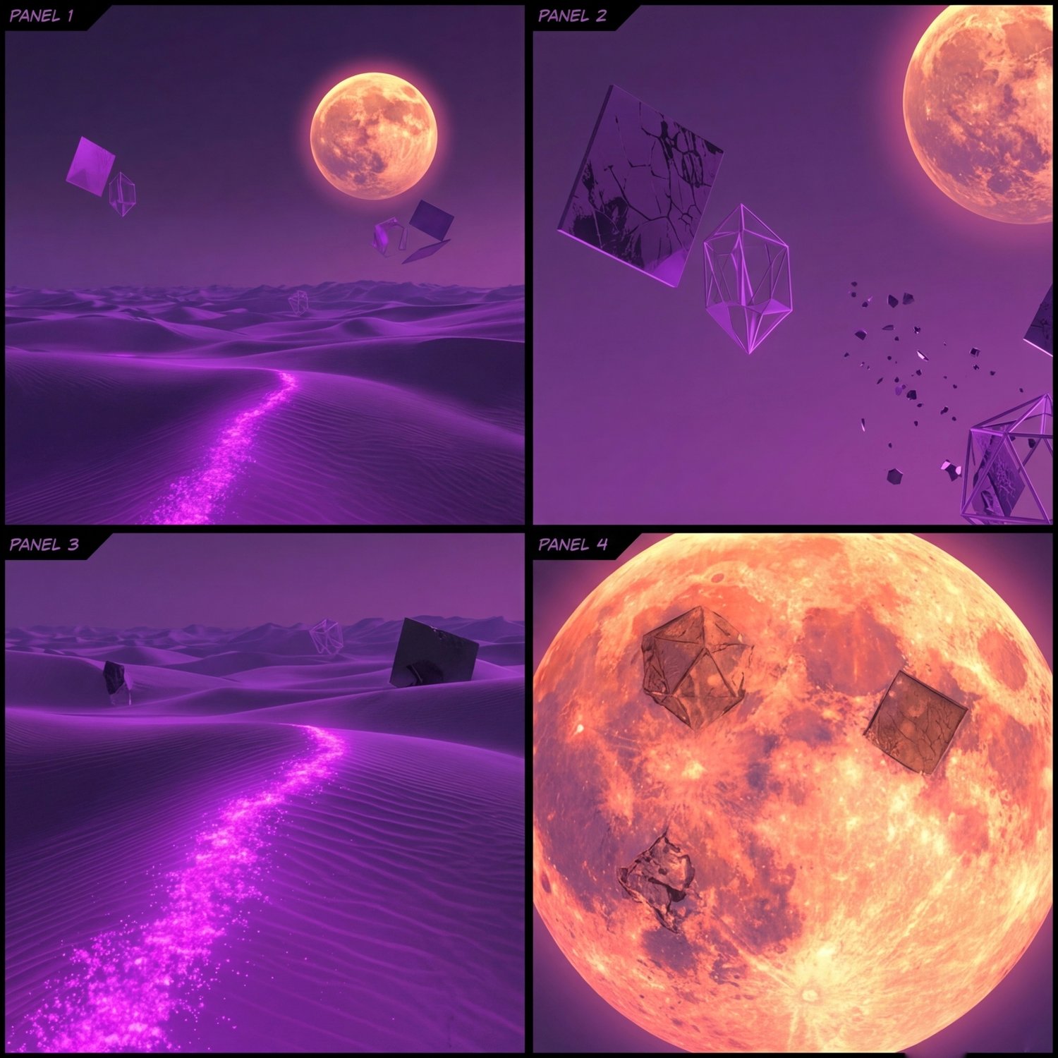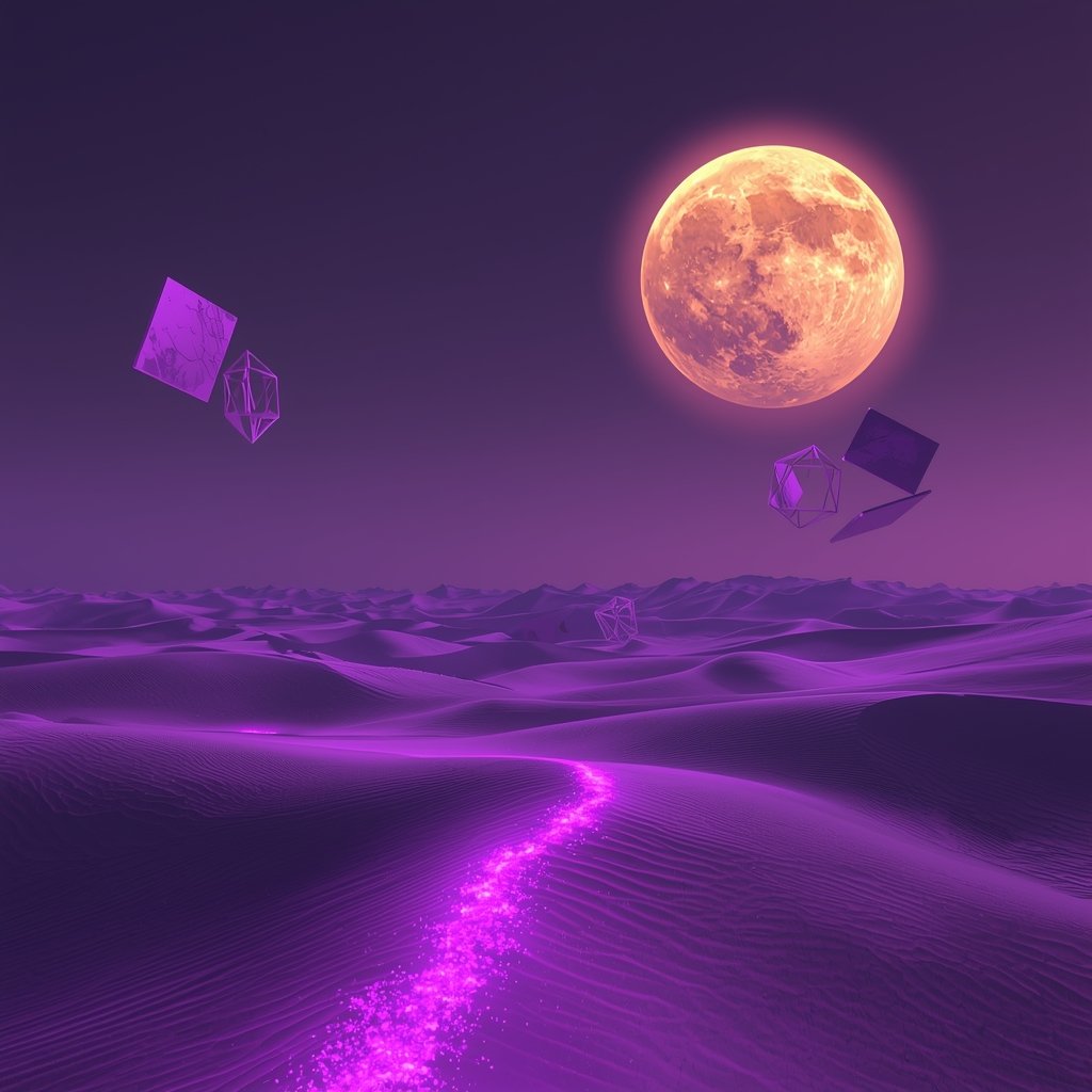 A surreal moonlit desert scene created in rich purples, glowing highlights, and dreamlike atmospheric details.