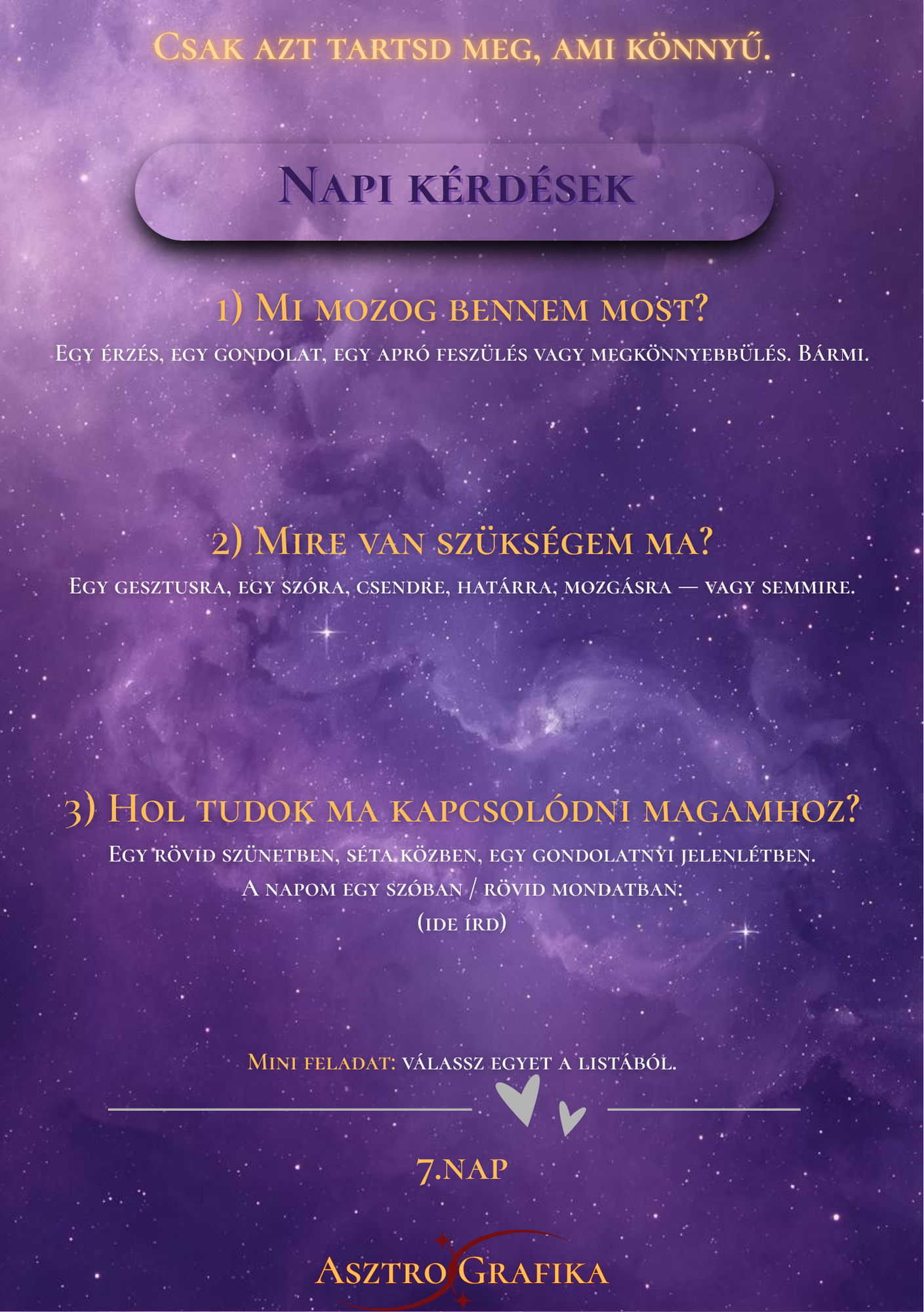 A program minden napra ad egy finom fókuszt, három mélyítő kérdést, egy mini feladatot, valamint heti lezárást és két exkluzív bónuszt: