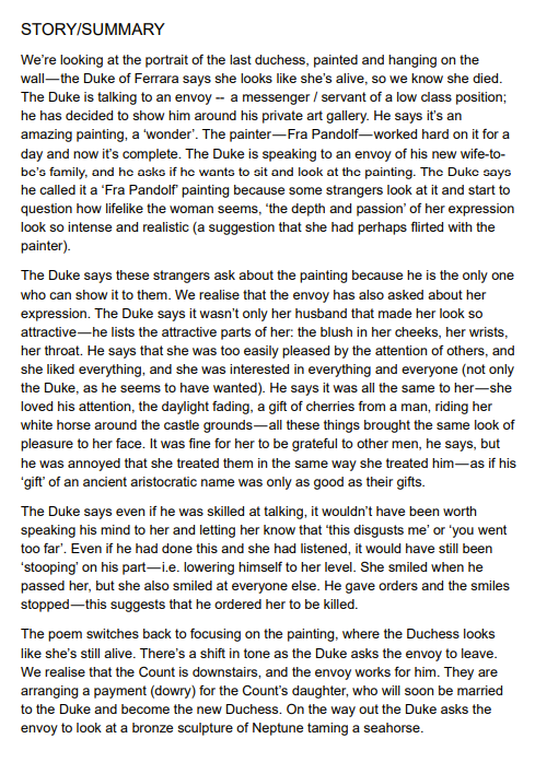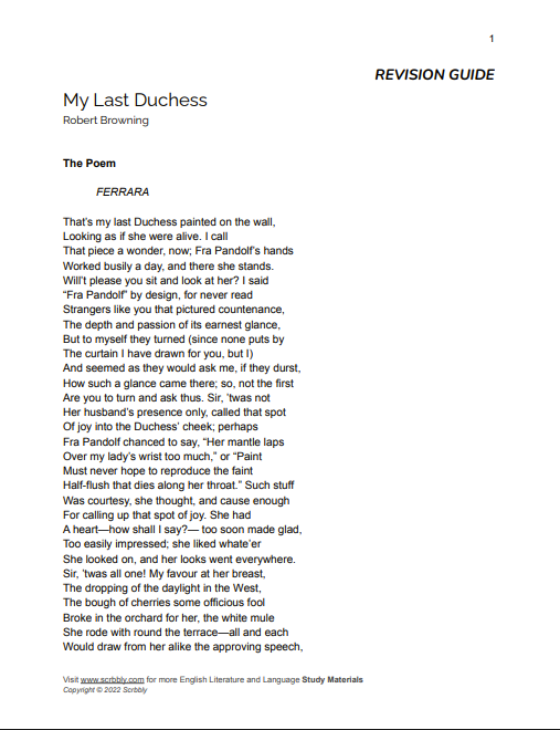A 12-page full study guide that breaks down Robert Browning’s ‘My Last Duchess’ for students of all levels (GCSE, iGCSE + A Level). All aspects of the poem are thoroughly covered, and extra tasks, exercises and potential essay questions are also included.