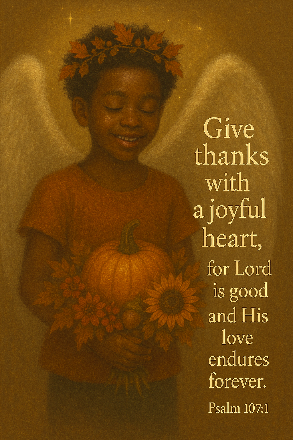 Celebrate the season of gratitude with this Autumn Angel Joy Poster, featuring a radiant child with angel wings, crowned in leaves and pumpkins, holding a bouquet of sunflowers and harvest blessings. Paired with the scripture “Give thanks with a joyful heart, for the Lord is good and His love endures forever,” this printable invites warmth, thankfulness, and spiritual delight — perfect for Thanksgiving bundles, devotional kits, or ministry gifts.