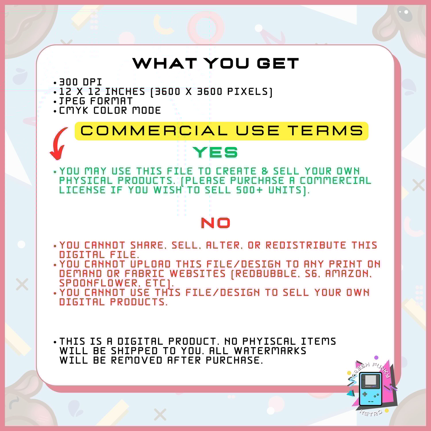- You cannot upload this file/design to any print on demand or fabric websites (Redbubble, S6, Amazon, Spoonflower, etc).