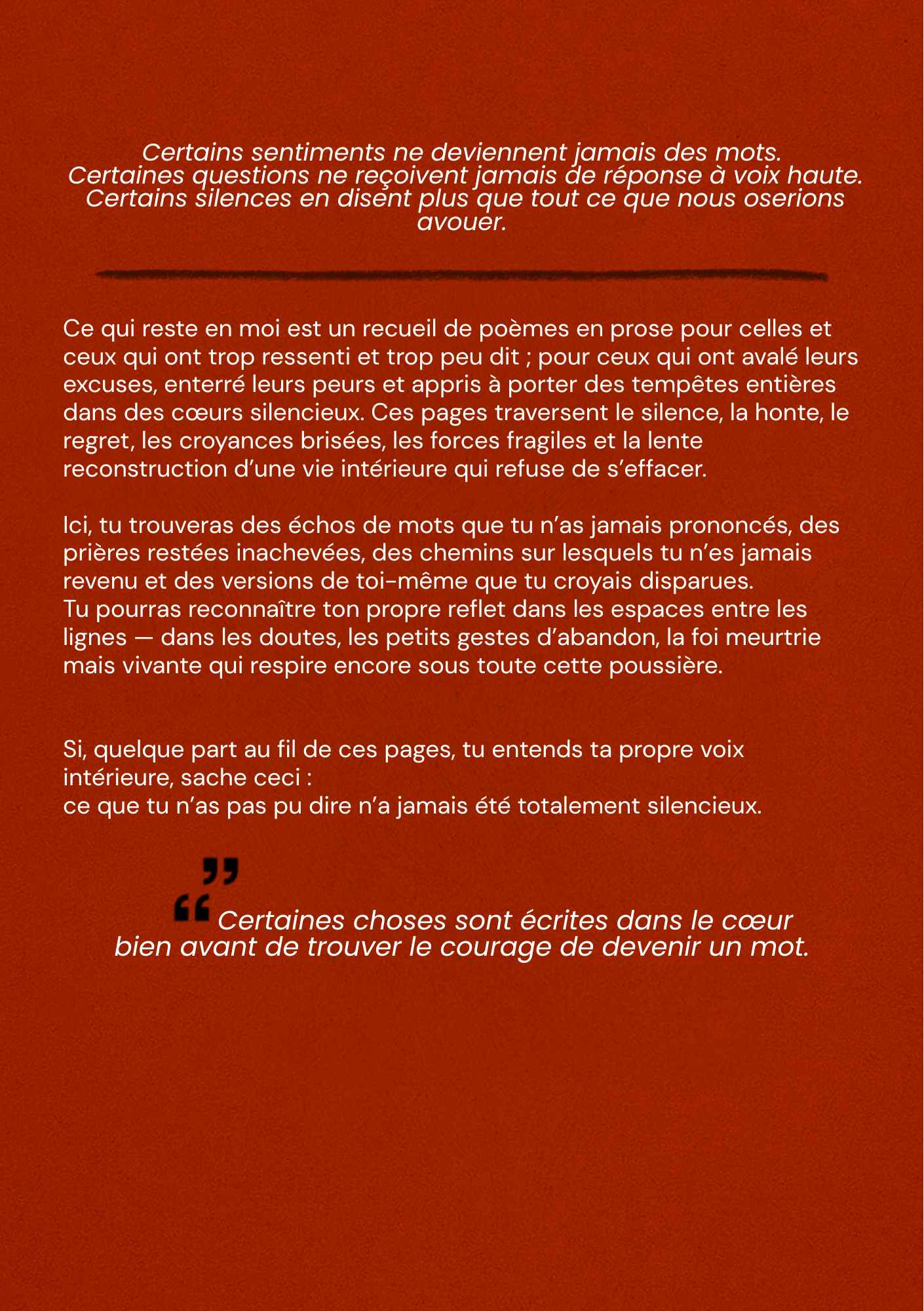 Ce qui reste en moi est un recueil de poèmes en prose sur les mots avalés, les guerres intérieures et ces lieux silencieux où la foi respire encore.