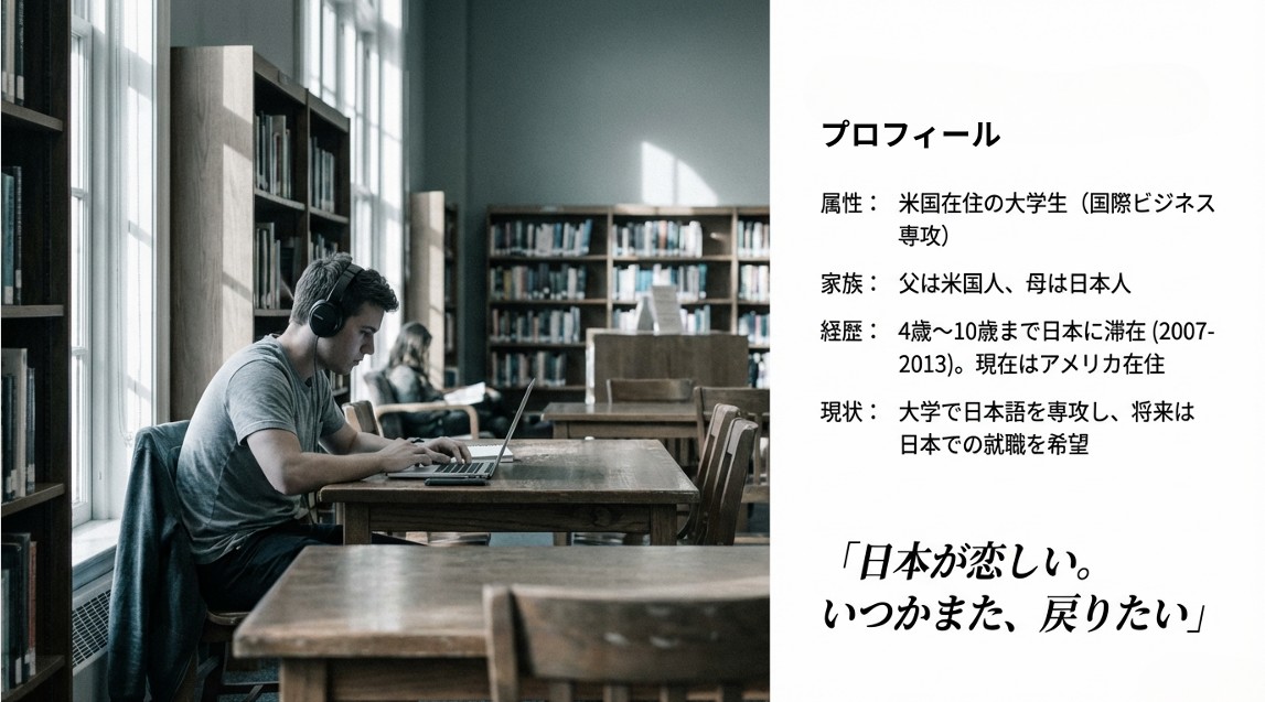 実例10:アメリカ在住で日本での居住経験も持つ日英バイリンガルの個人による、自身の生い立ちと言語習得のリアル体験談|親御さんに読んでいただきたい|ストーリーボード|(全11ページ)PDF download|約500円(ほぼワンコイン)