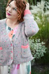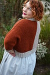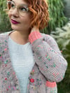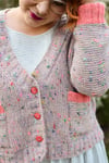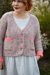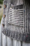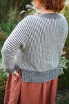 A sideways cardigan knit in Garter stitch and 2x2 ribbing with a slipped stitch detail along the sleeves – with a modular and customizable construction.