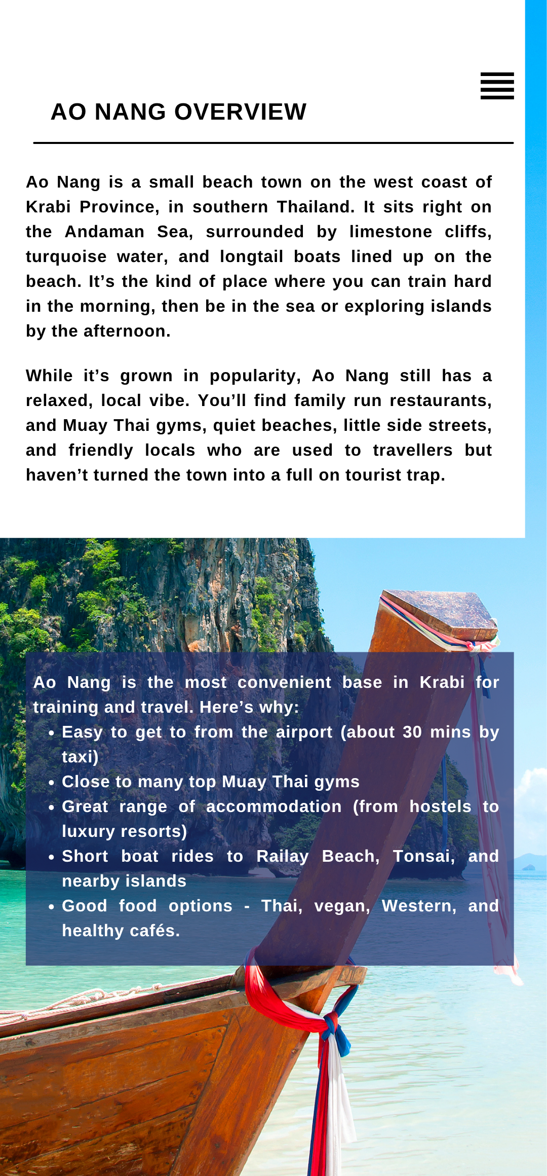 Built over 8 months, this guide is smarter, easier, and designed with fighters and travelers in mind. With quick links to maps and insider tips, it’s not just another guide, it’s your passport to training hard, eating well, and experiencing Ao Nang like a pro (or at least looking like one).