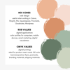 + Detailed Hex Codes, RGB, and CMYK values for each color
