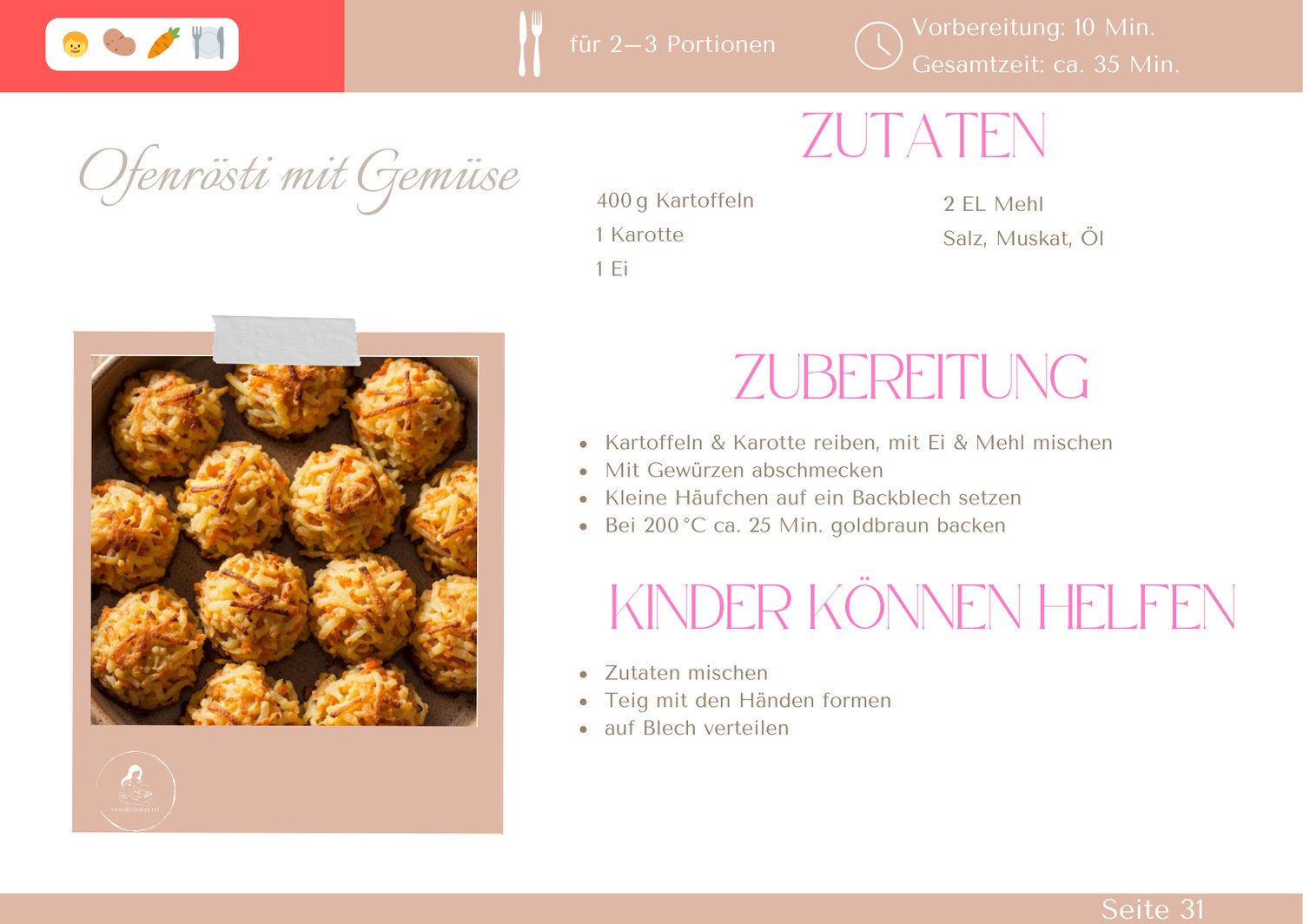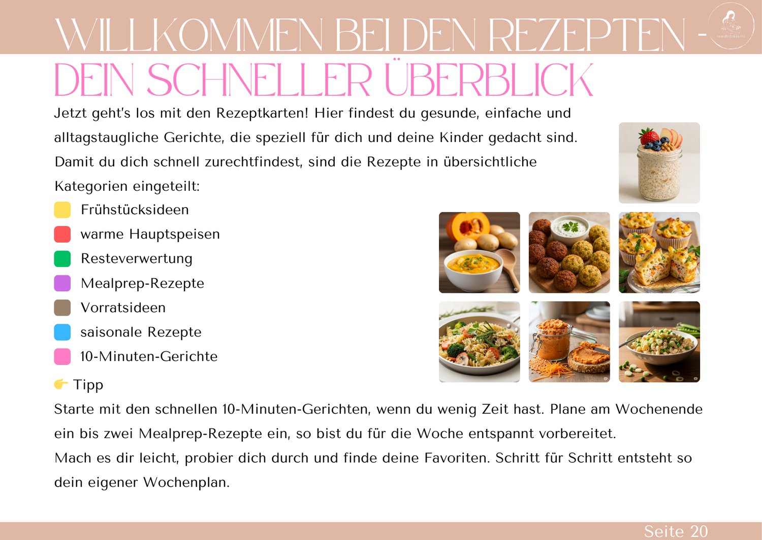 Das digitale Rezeptkarten-Set ist dein Gamechanger für den turbulenten Mama-Alltag. Es liefert dir nicht nur leckere Gerichte, sondern die gesamte Organisation drumherum.