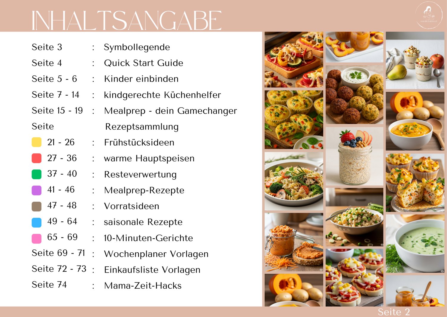40+ kinderfreundliche Alltagsrezepte: In farbcodierten Kategorien, inklusive Frühstück, Hauptgerichte, Mealprep und 10-Minuten-Gerichte.