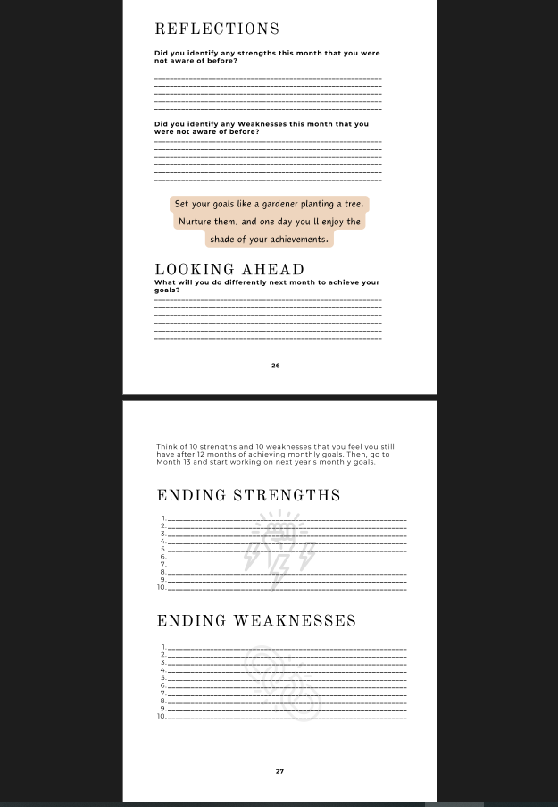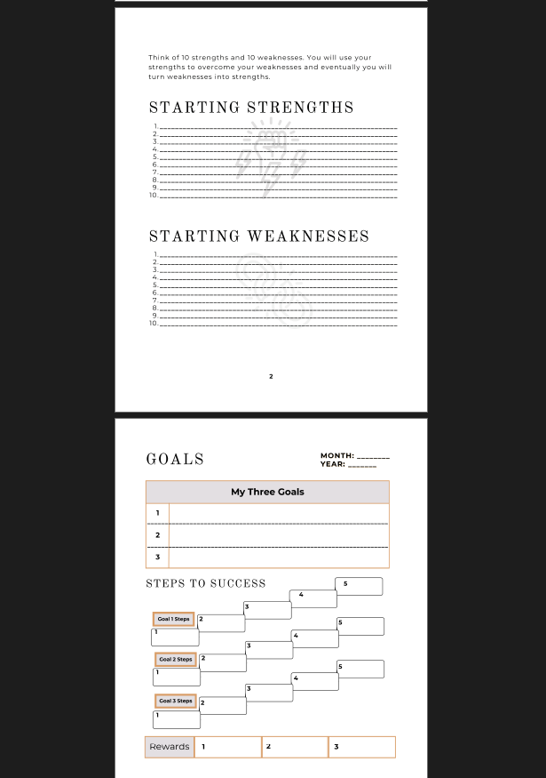 Setting goals can be very daunting when you don't know how to do it correctly. This journal helps you set reachable goals and helps you achieve success in life! We have included sections to record strengths and weaknesses, self-reflection sections and inspirational quotes to help motivate you.