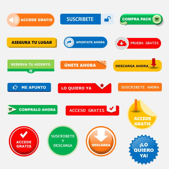 - 20 Diseños de Botones Web en PNG para diseñar tus llamadas a la acción. (5 colores cada botón = 100 botones)