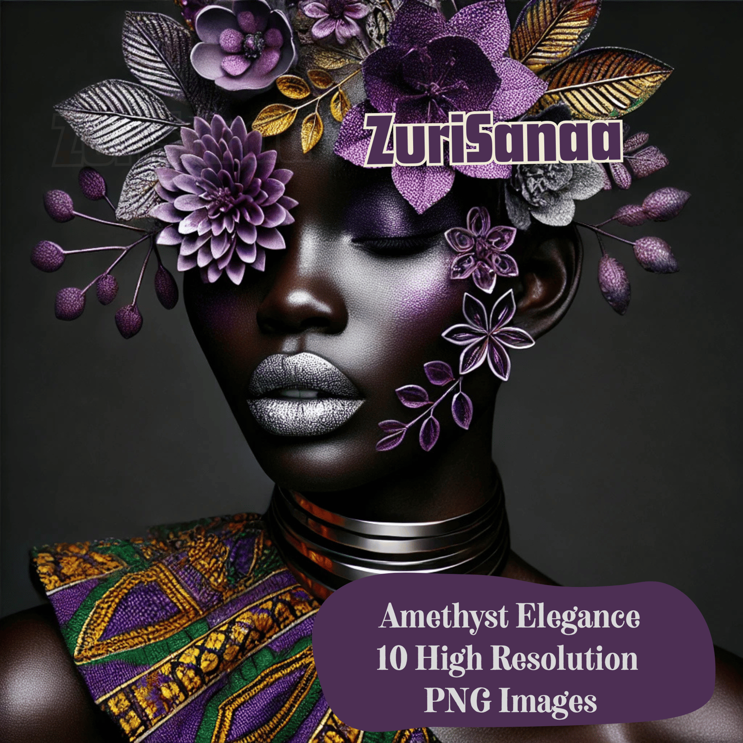 Step into a world of stunning artistry with the "Amethyst Elegance" 10 PNG Bundle. This collection features breathtaking, high-resolution portraits celebrating the beauty and sophistication of Afrocentric design. Each image showcases a striking figure adorned with intricate floral arrangements, bold metallic tones, and regal details that exude elegance and power.