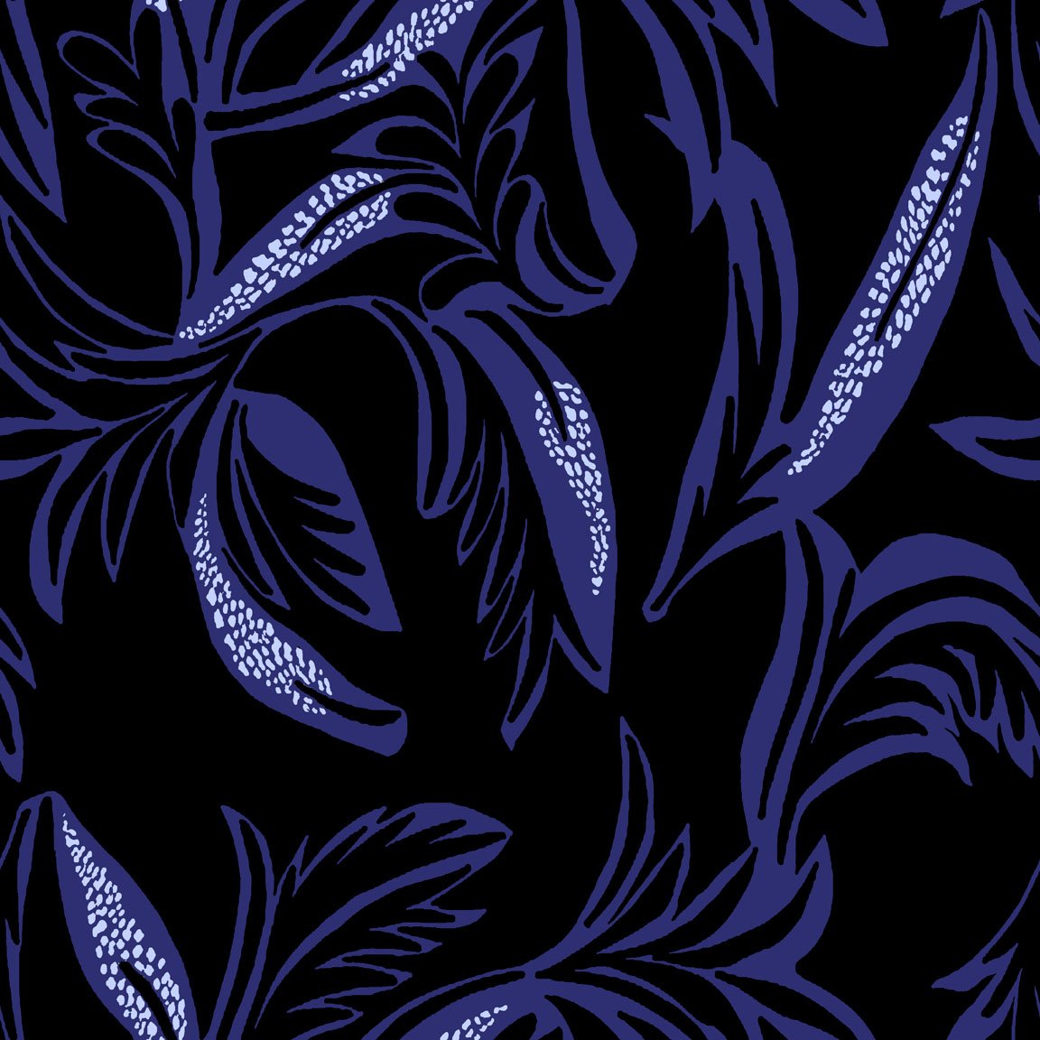 Dramatic tropical leaf silhouettes with textured details on a deep black background.