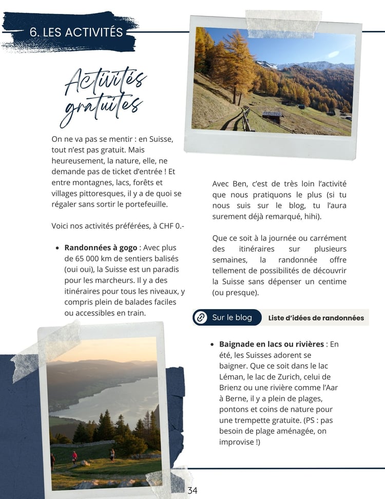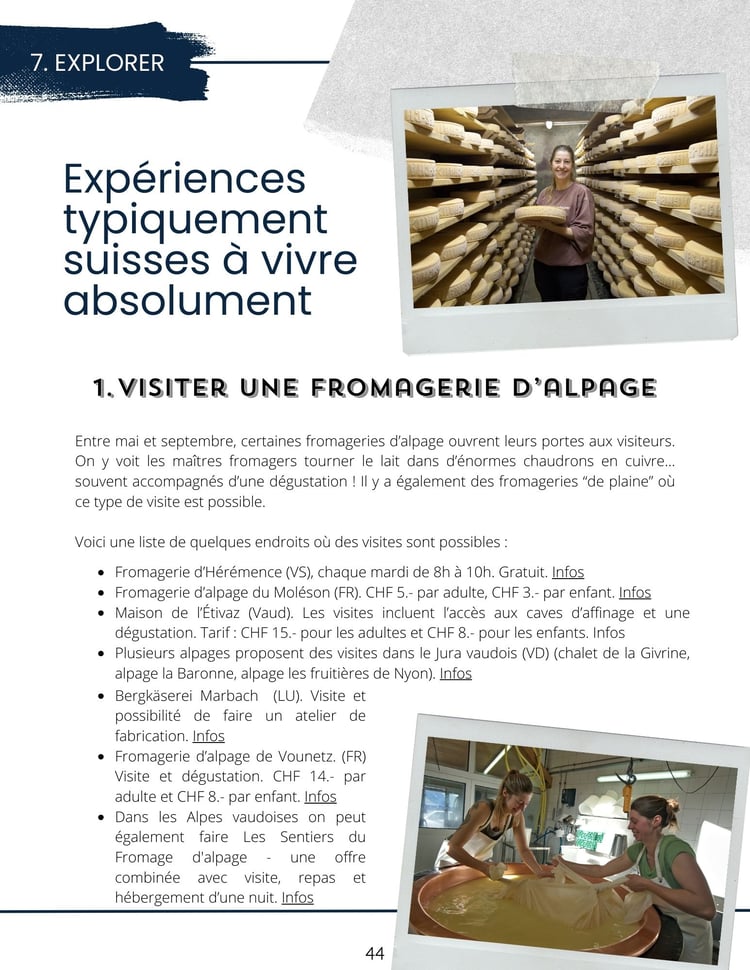 - 75 pages de conseils ultra-concrets pour explorer la Suisse, que vous soyez randonneur, foodie, ou fan de musées