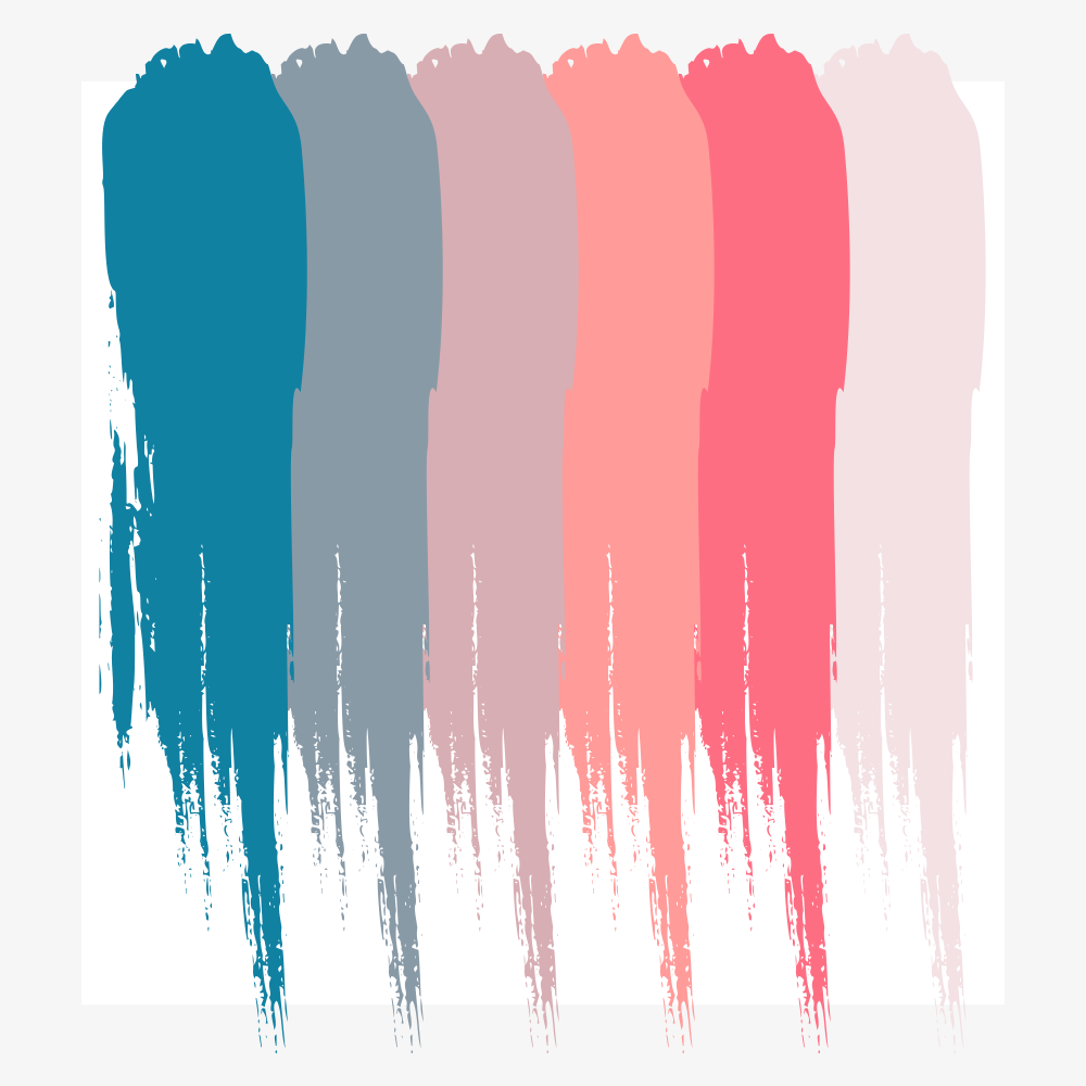 Inspired by the beauty of a sunset over the sea, this palette includes a stunning mix of deep blue, blue gray, ash pink, deep peach, bright coral pink, and blush pink—each carefully chosen to create a look that’s both energetic and elegant.