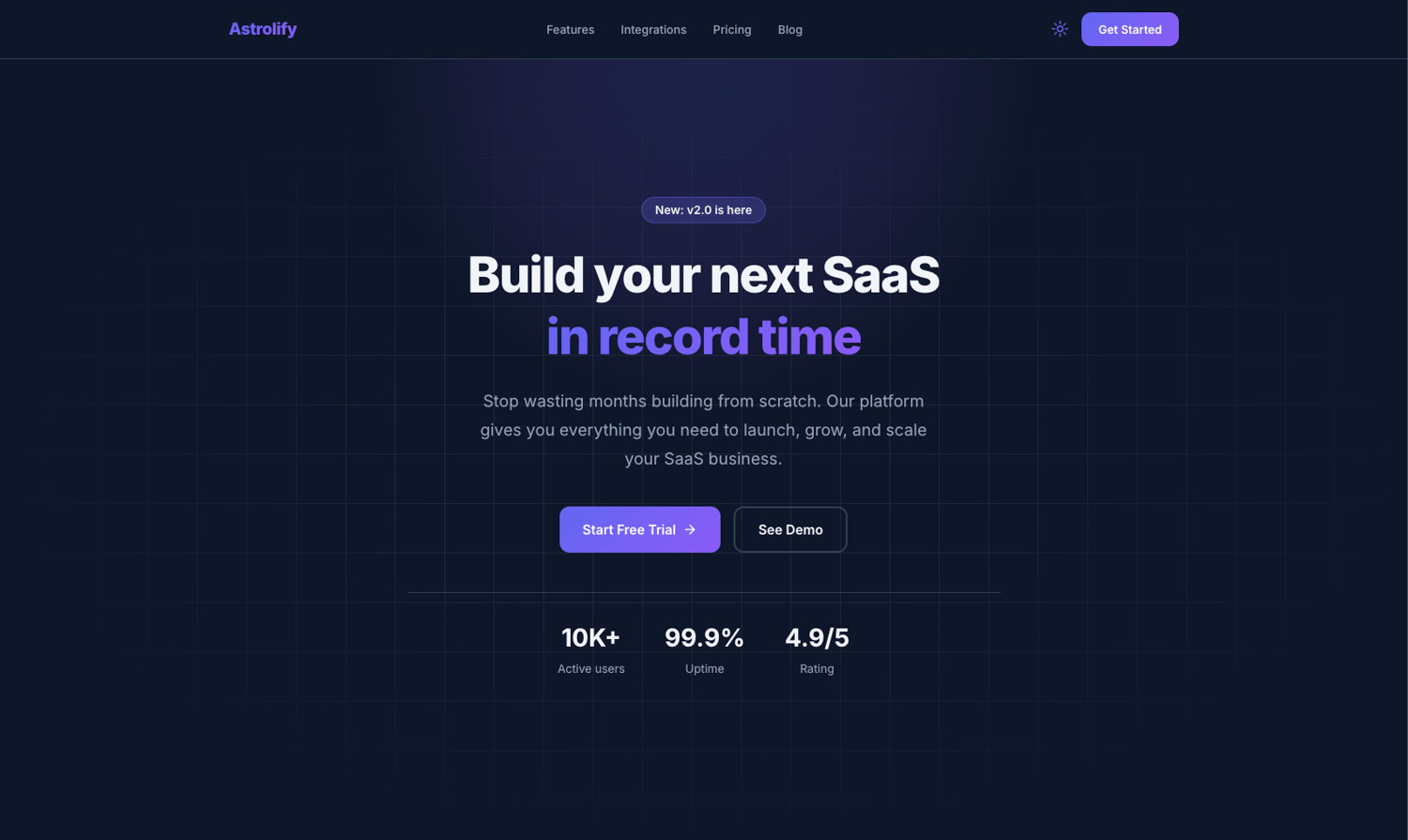 Hero • Stats • Logo Cloud • How It Works • Features • Feature Tabs Comparison Table • Integrations (with filtering) • Trust Badges Pricing • Testimonials • Team • Roadmap • Blog Preview • FAQ • Contact Form (Netlify-ready) • Newsletter