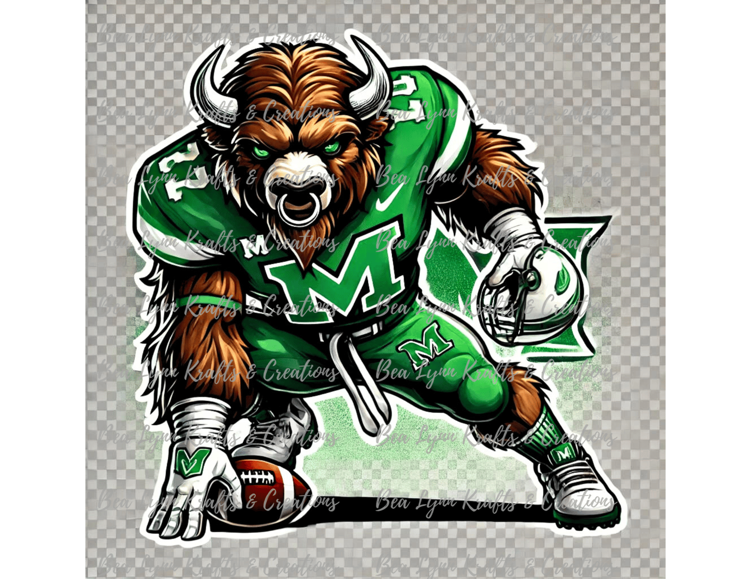 Attention Marshall fans! Take your Thundering Herd pride to the next level with this high-quality transparent PNG of Marco the Bison, the legendary mascot of Marshall University. This fierce and vibrant design features Marco in the official Marshall green and white, ready for game day with the iconic "M" logo displayed on his uniform. Perfect for any true Herd fan who wants to showcase their school spirit!