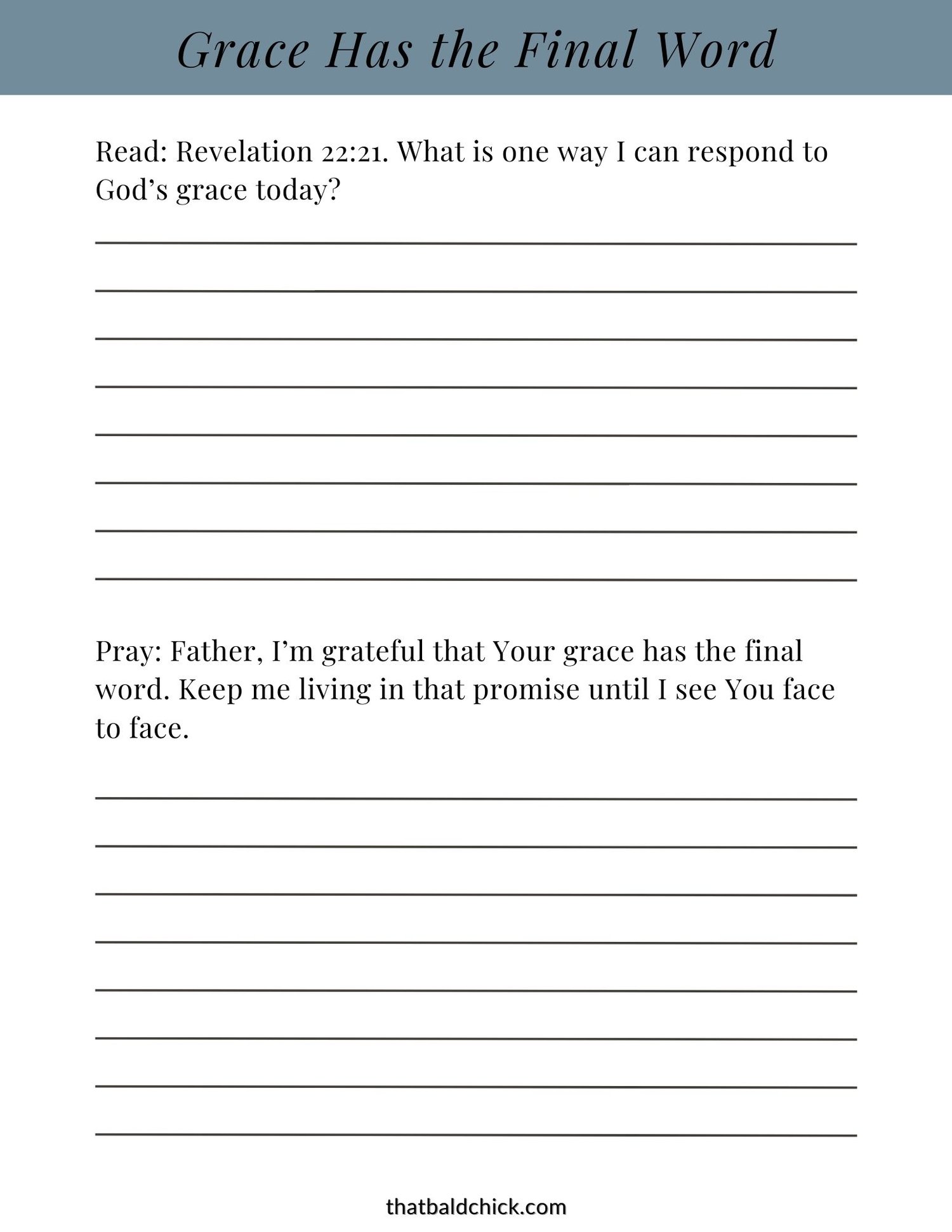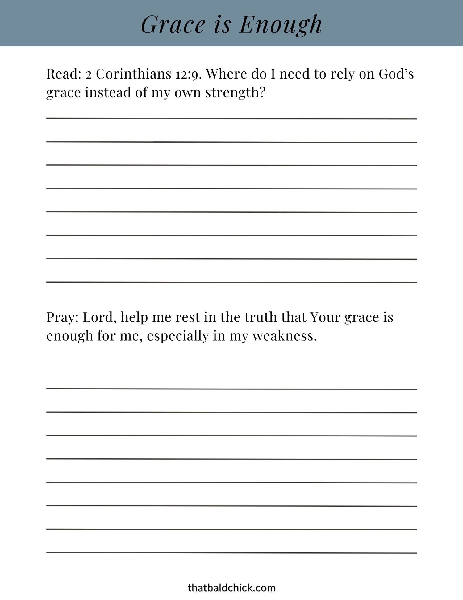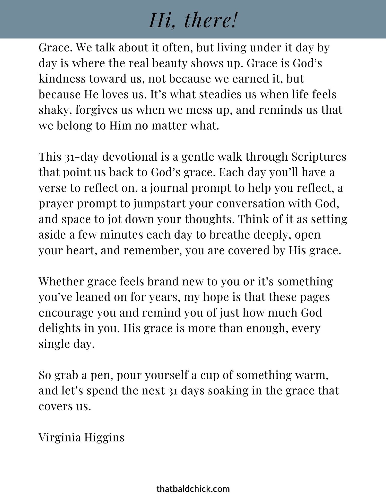 The Grace Covering Devotional is a gentle walk through Scriptures that point us back to God’s grace. Each day you’ll have a verse to reflect on, a journal prompt to help you reflect, a prayer prompt to jumpstart your conversation with God, and space to jot down your thoughts.