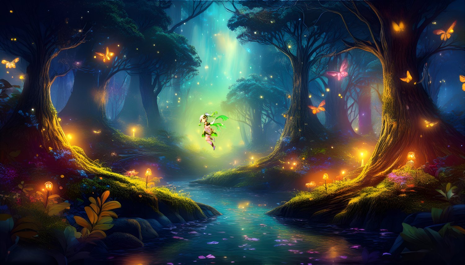 The image depicts a magical, enchanted forest scene. A vibrant, ethereal glow illuminates the trees, casting long, dancing shadows. In the center, a small, winged figure hovers above a shimmering stream, surrounded by glowing flowers and fluttering butterflies. The scene is filled with a sense of wonder and mystery, with bioluminescent mushrooms and twinkling lights adding to the magical atmosphere and the forest guard by the genshin impact character nahida a dendro archon .