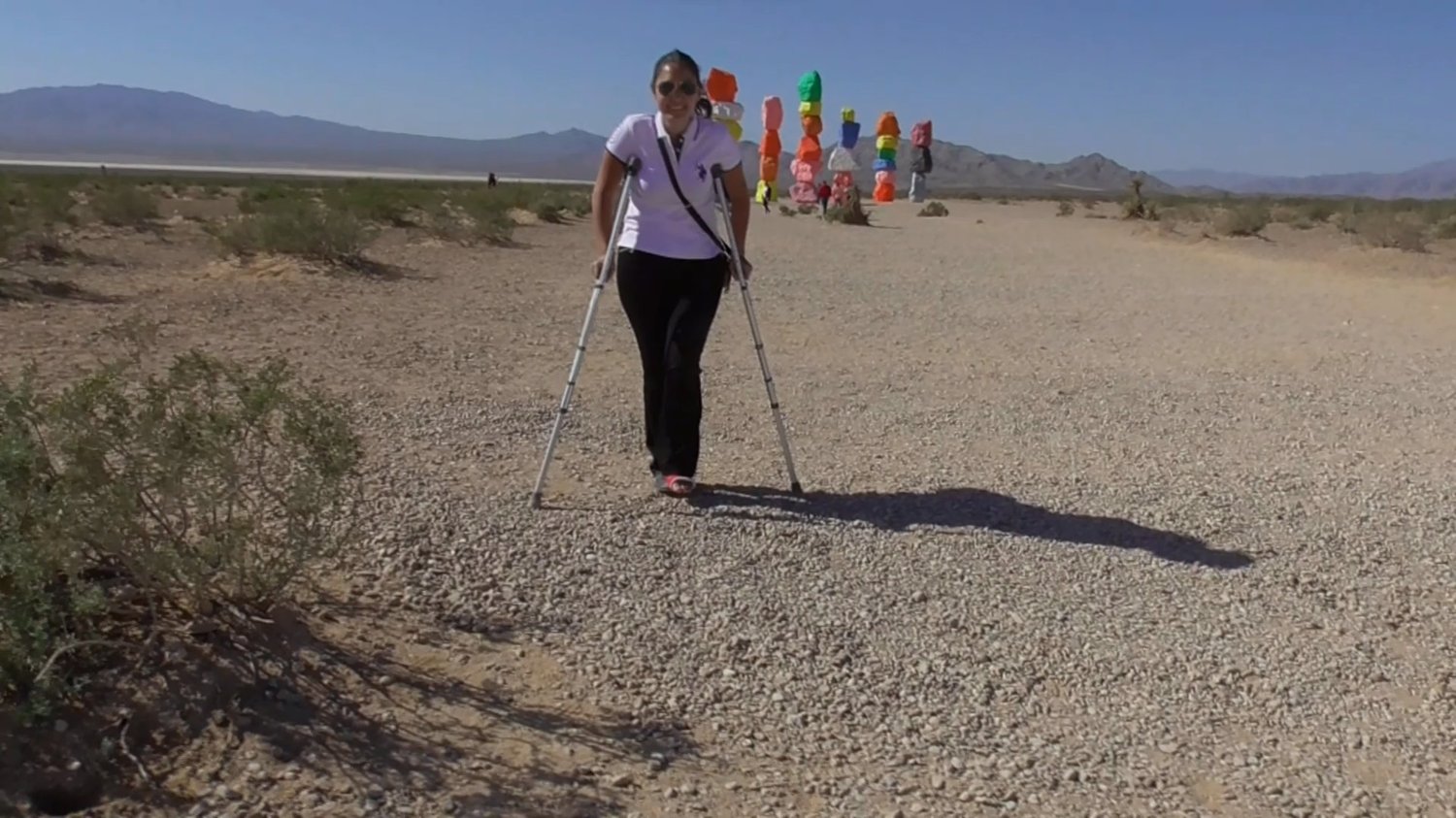 Elisabeth is outside Las Vegas today, crutching on very uneven ground using herbunderarm crutches.Her left foot is sadly broken and casted in a red SLC.