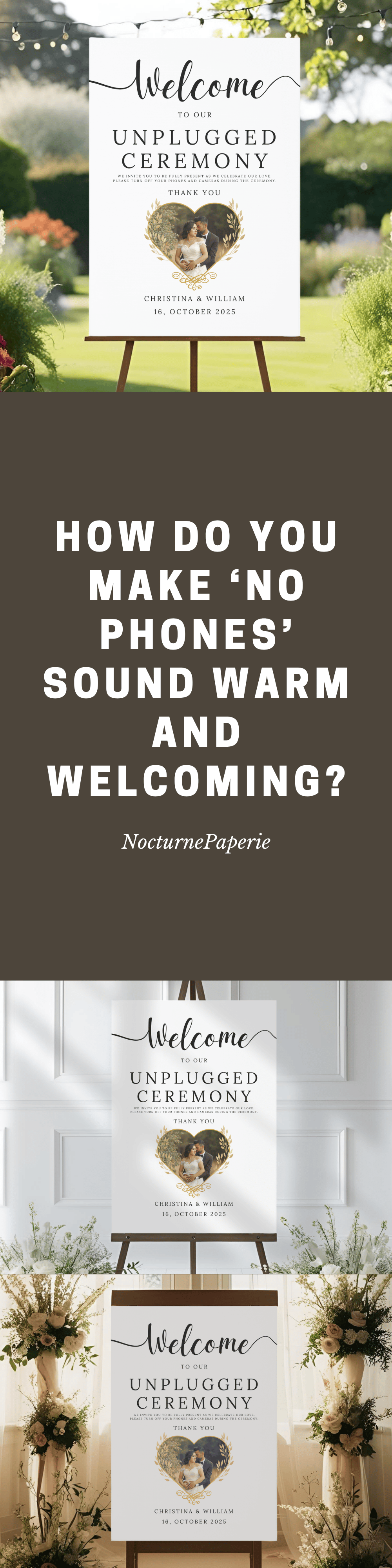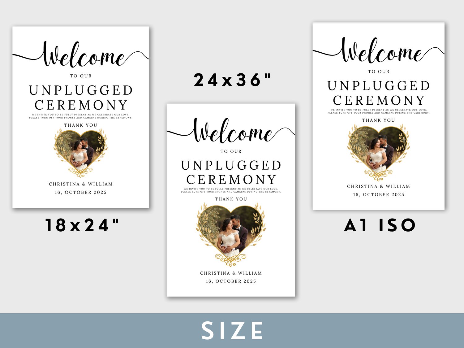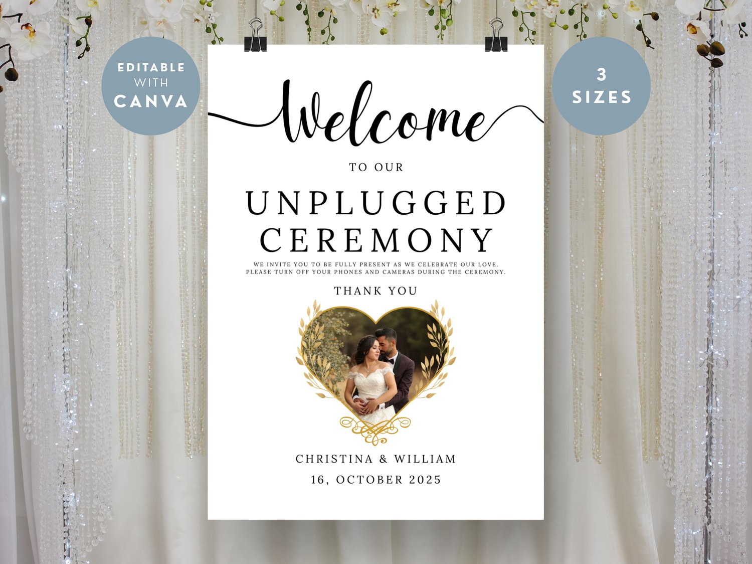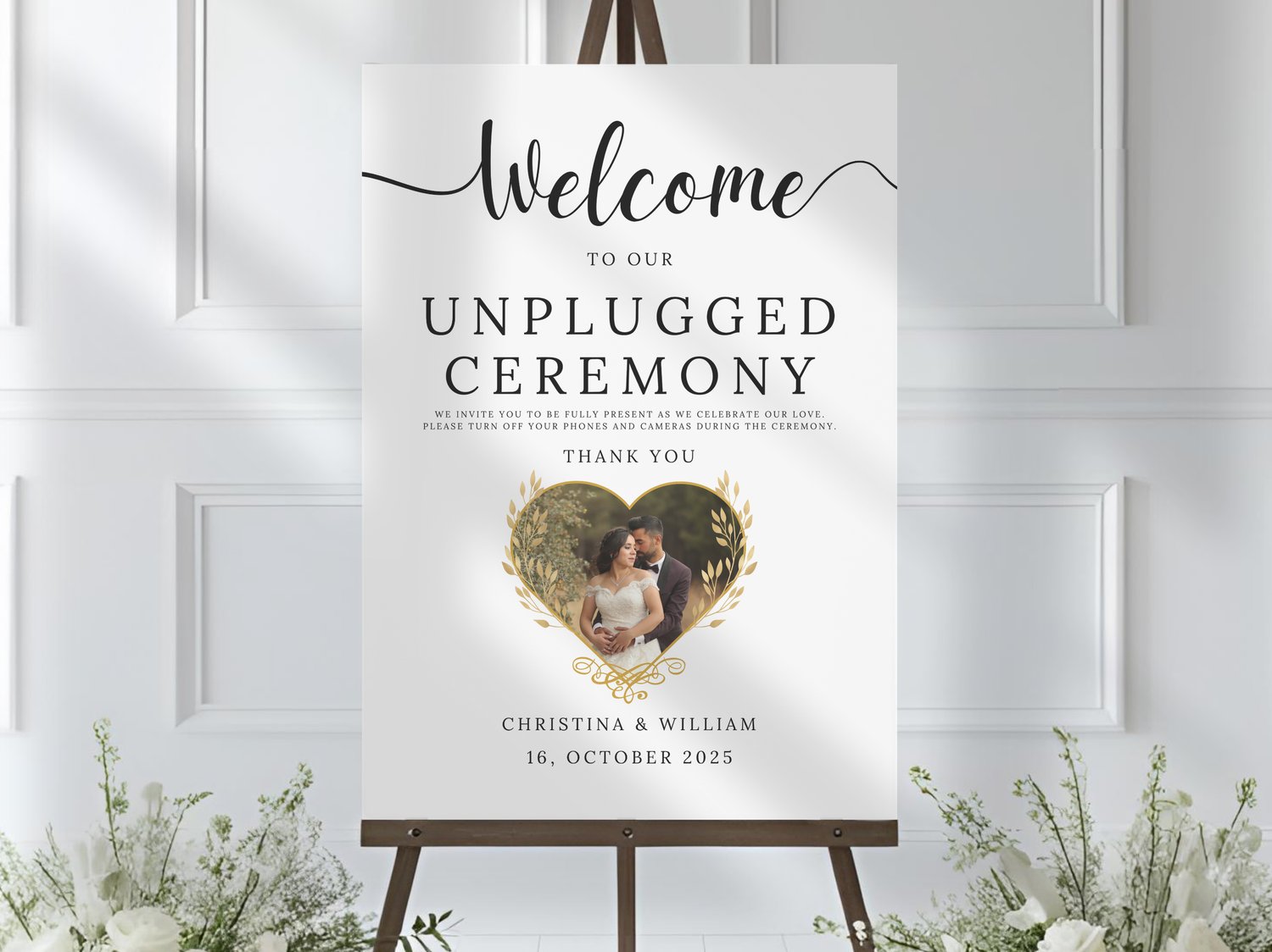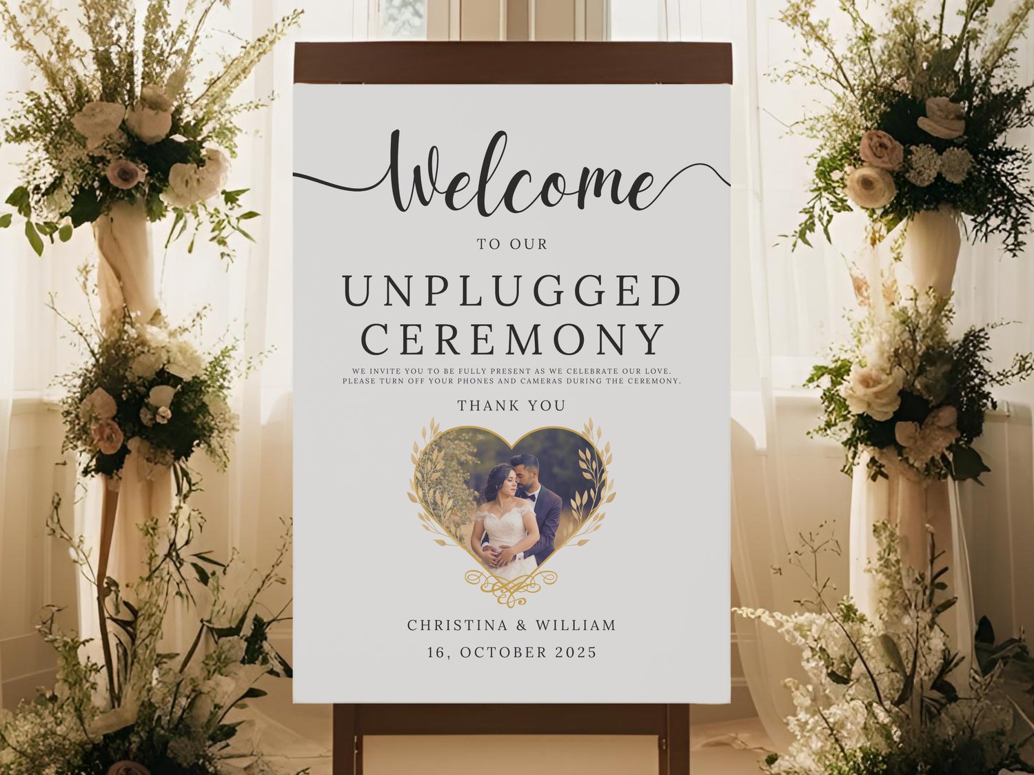 Ask your loved ones to put their phones away and enjoy the celebration with this unplugged wedding welcome sign featuring your couple photo frame. Designed for a romantic atmosphere, this printable template beautifully enhances your wedding party entrance.