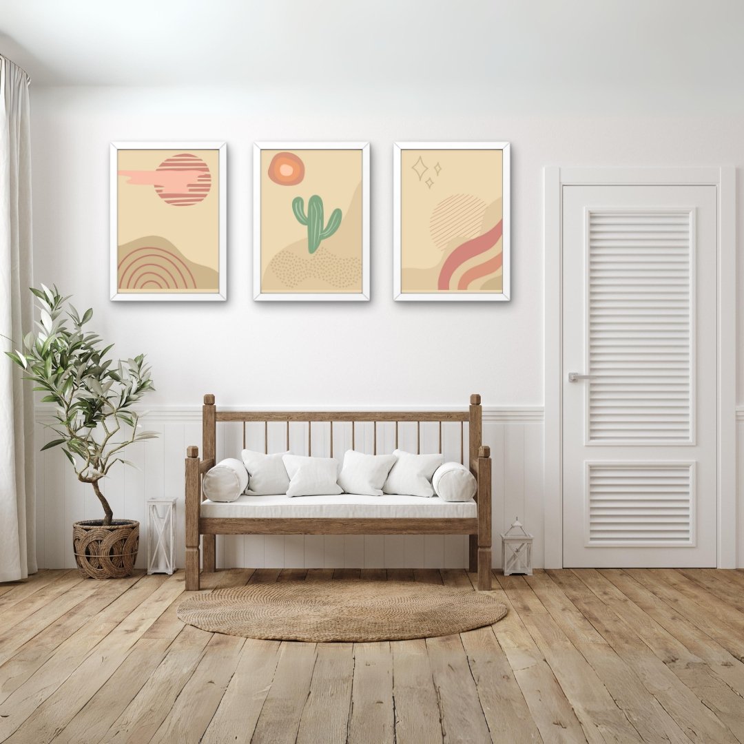 Introducing a set of three wall art prints, crafted to add a touch of uniqueness to your living or workspace. This particular set comprises of three digital prints, each styled in a combination of neutral browns, greens, and reds. The use of these colors makes the prints versatile enough to complement any interior decor theme.