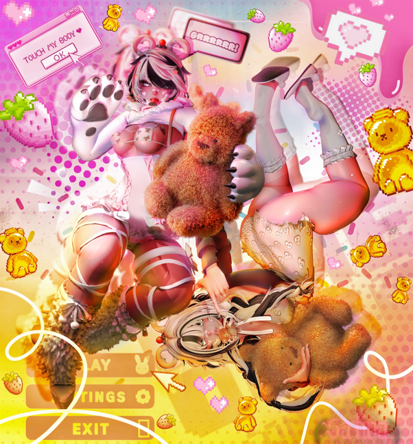 - Clothes- Kitty imposter + Bandaids + Strawberry bear + Leg wraps + wrist lace + cake backpack + jammie set + pj bottoms with slippers, Teddi set, lacey set, longsleeve + necklace + body piercing + laced heels + velvet shorts, lace bra and panties + lace corset + princess heels with socks, TANK TOP BY ME (NO REUSE, MUST PURCHASE IN MY STORE)
