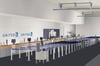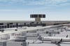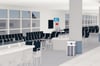 -Complete interior of Terminal D with gate areas, check-in area, lounge, and airport stores.