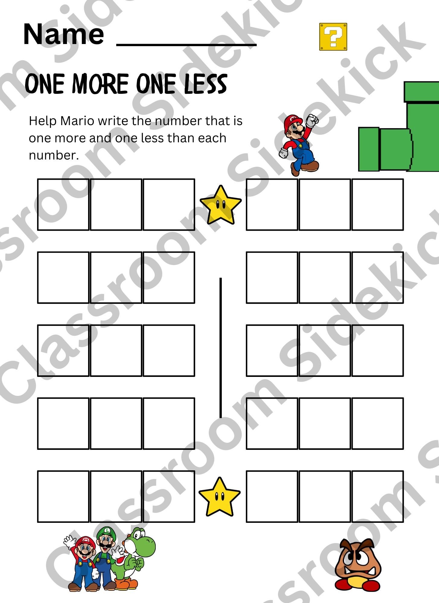 Make learning math fun with this Super Mario-themed worksheet designed to help kindergarteners master the concept of one more and one less! Perfect for small groups, math centers, or homework practice. Features bright visuals, favorite characters, and easy-to-follow number boxes to boost number sense and early math skills.