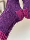 100g of yarn will make up to a UK size 10 of these socks. Adding a 20g mini-skein as a contrast colour will allow you to make a larger size.