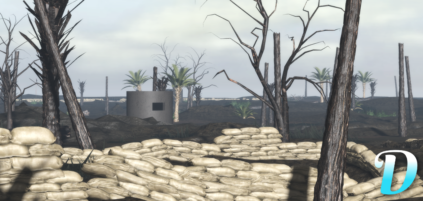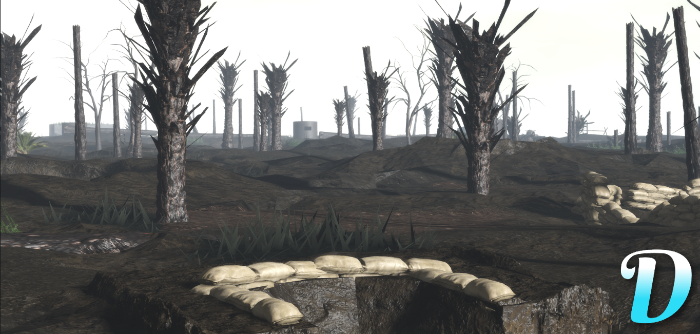 This Roblox map recreates the New Guinea campaign of the Pacific War, which spanned from January 1942 to August 1945. In early 1942, the Empire of Japan invaded the Territory of New Guinea on January 23 and the Territory of Papua on July 21, subsequently advancing into western New Guinea starting March 29. The map features a sprawling battlefield dotted with cover positions, destroyed tanks, shelters, and trenches.