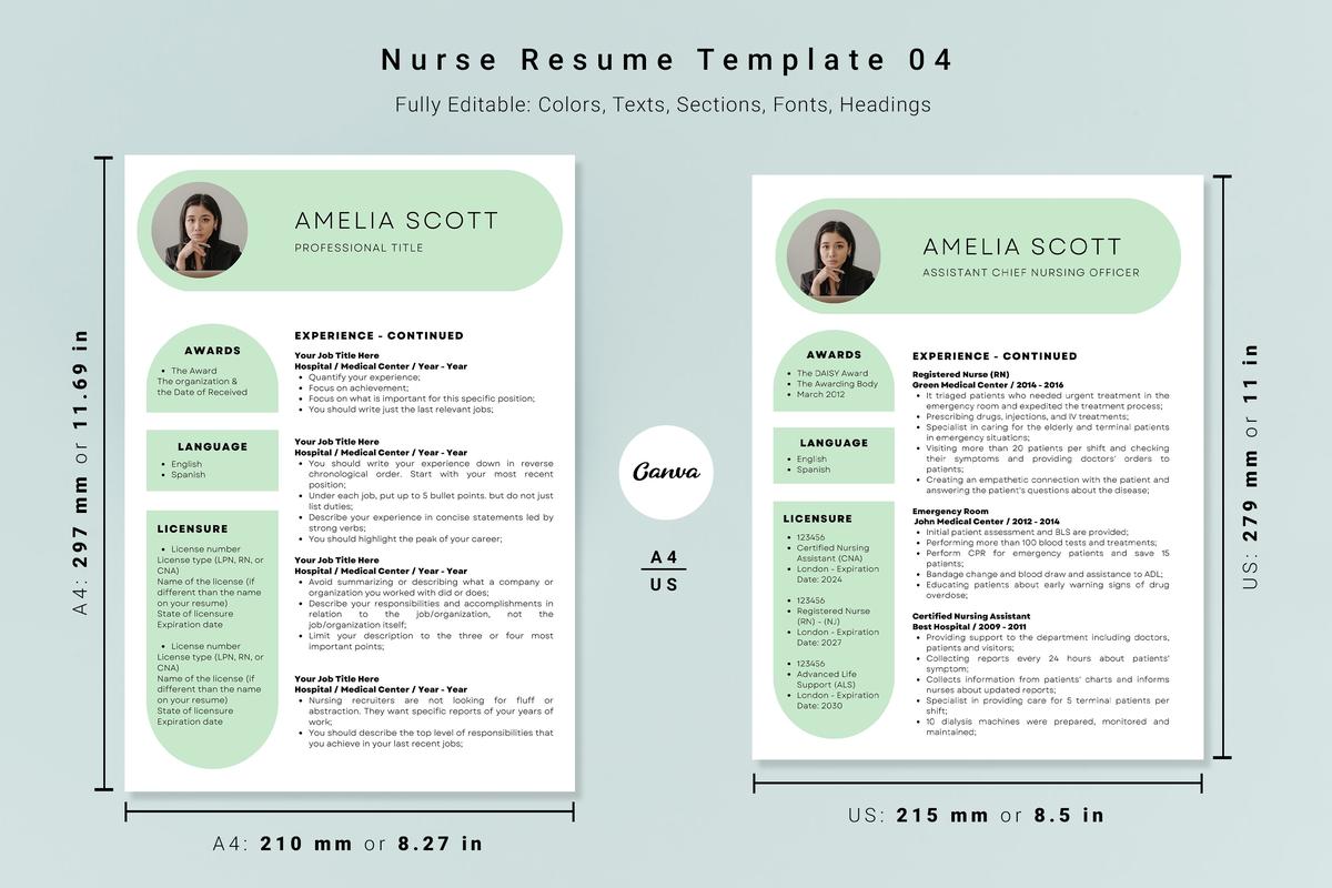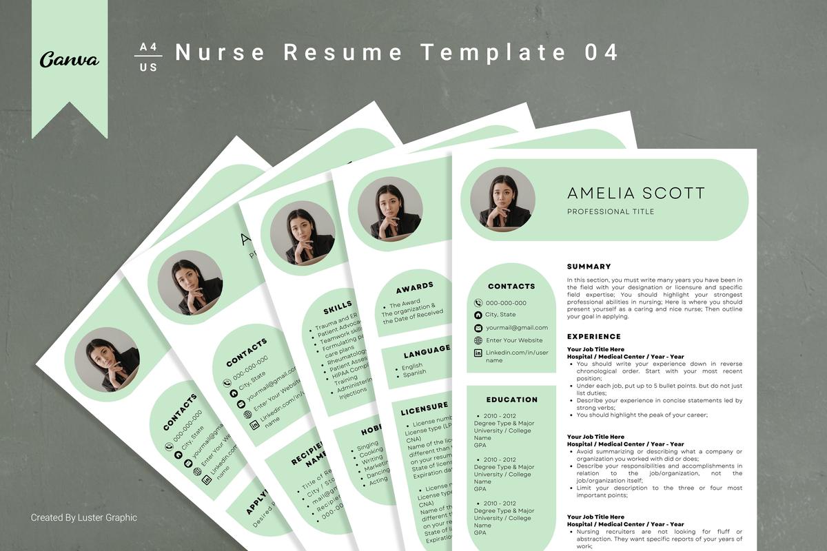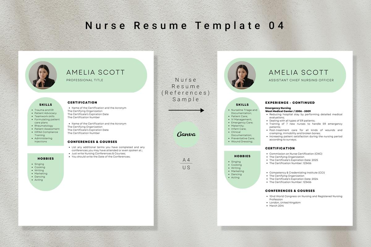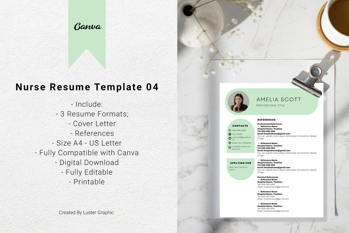The Nurse Resume Canva Template (Version 04) pack is editable & printable in (A4 & Us Letter Size) and includes 3 Format resumes, Cover Letter, & References with Images on an online Editing app (Canva) & was created with ATS in mind. This Creative Template is suitable for Registered Nurses, Medical Assistants, Pharmacists Graduates, New Grad or Student Nurses, & Healthcare Professionals. You can easily change, edit & customize the Colors, Images, Text, Headings, Body Texts, Sections, the number of pages, & also add details, & adjust spacing as you need to look useful, Graphical, Professional, Clean, Modern & Stylish.