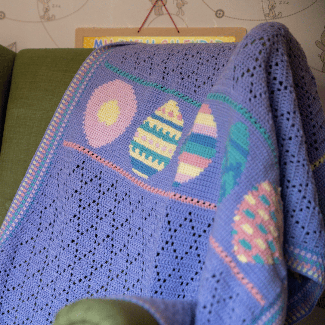 Whether you’re crafting a filet crochet blanket for yourself, making a unique crochet baby gift, or adding a seasonal touch to your home, the So Eggstra Blanket pattern offers clear guidance and beautiful results with every stitch.