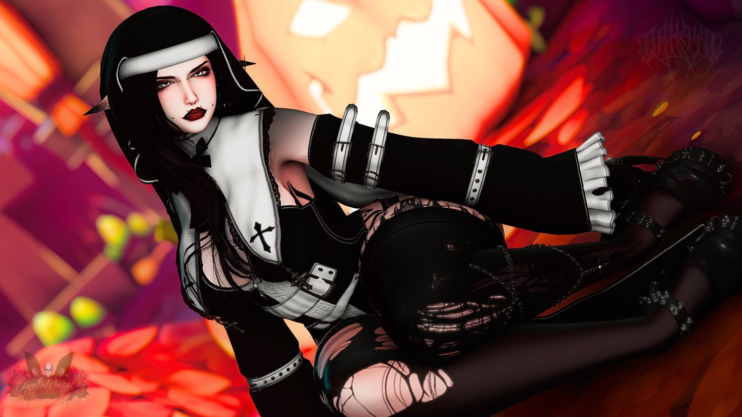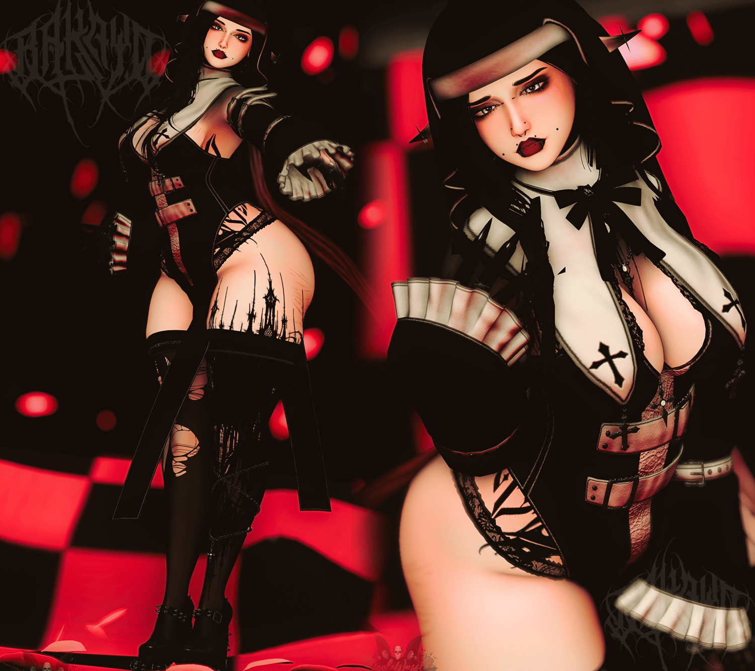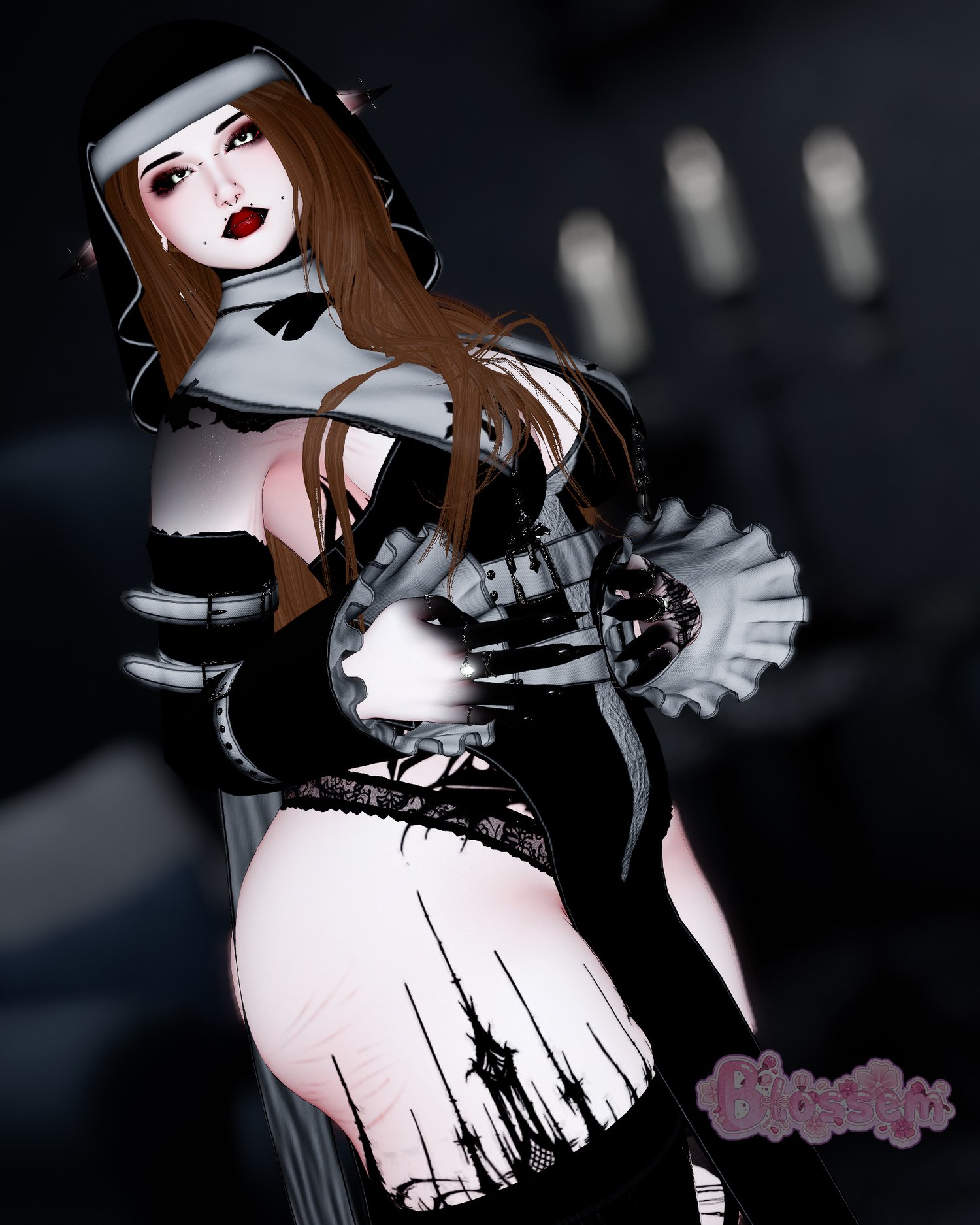 Skin Normal, Corset-top, Crop-top, All rosary accessories, Elf ears, Arm-warmers, Spank Decals, Dildo Mesh, and Lipstick made by me.