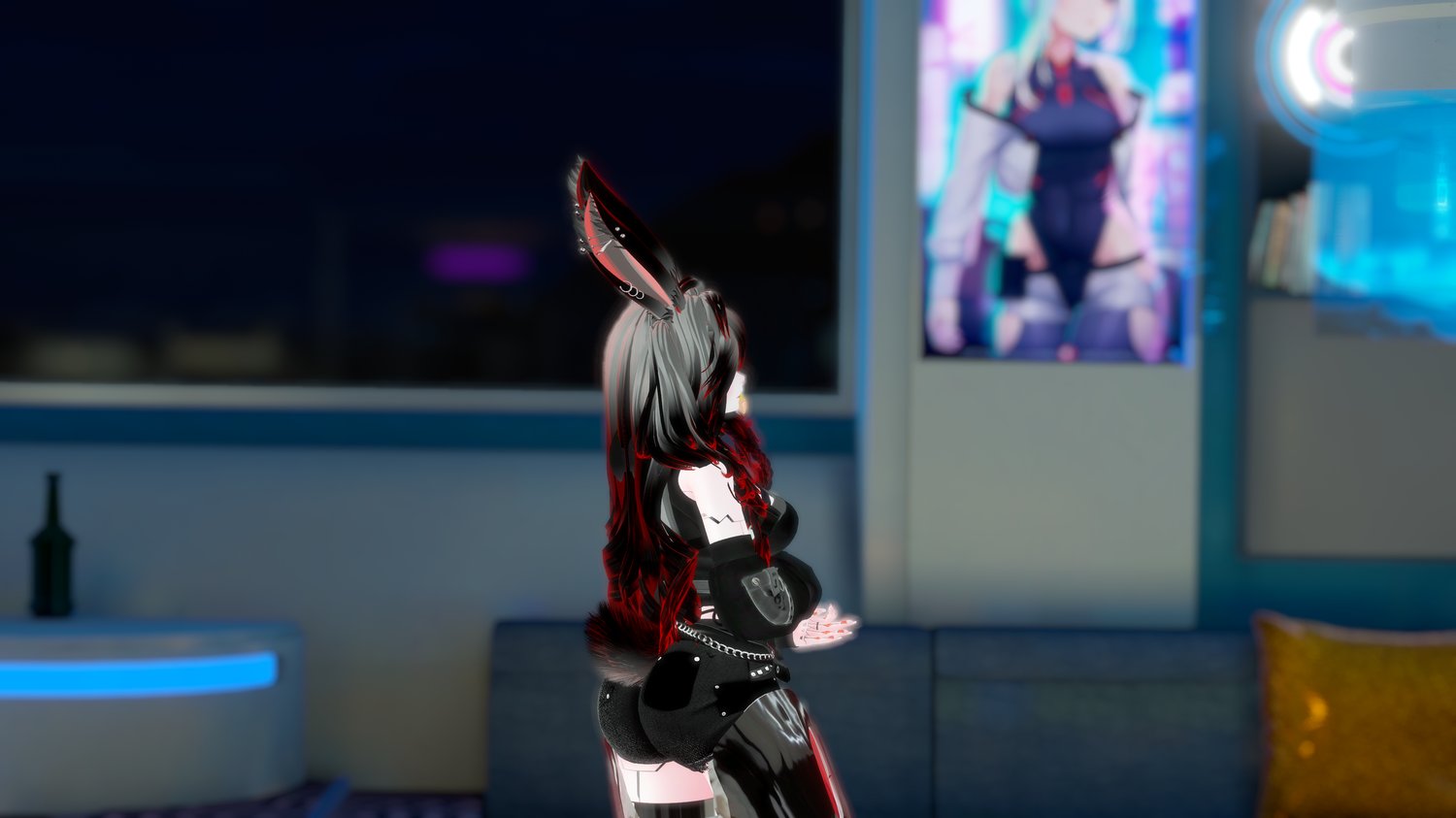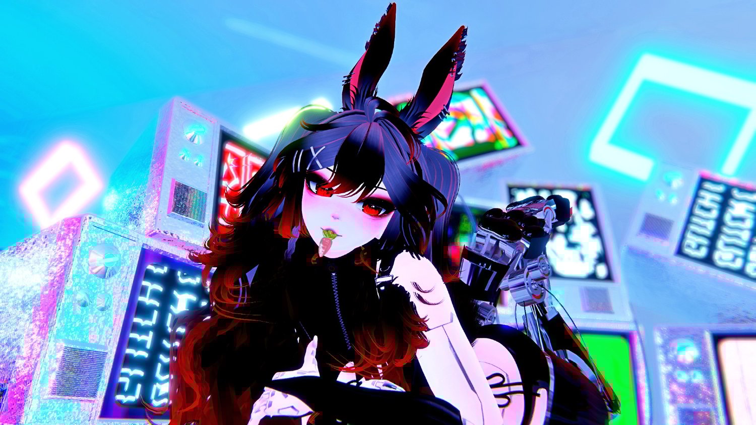 Cyber Spine By Darcy , Wires By Eggly , Cyberpunk Tattoos By Khaos M0nst3r , Pretty Face Textures By YingYany , Bunny Shoes By Zoeyorly , Bunny Pasties By Aphriel , Matt Caps By Awmi,Briistormvr,Peep's Boutique , Starlight Head By Starlynn , Base By VR , Zinpia Ears and Tail By Winks , Gogo Loco By Franada , Makeup By Kisssanity , Bikini By Dalla1re , Outfit "RUMOR" By Sadge , Eye Lashes By Toffee , Doll Key By GMsbox , Long Hair By MINKI , Short hair and Pigtails By Saikura , Bunny Paws By The Thicc Whitch , Cybergoth Hoodie By Lesh ,Carrot Plushie By Mondei
